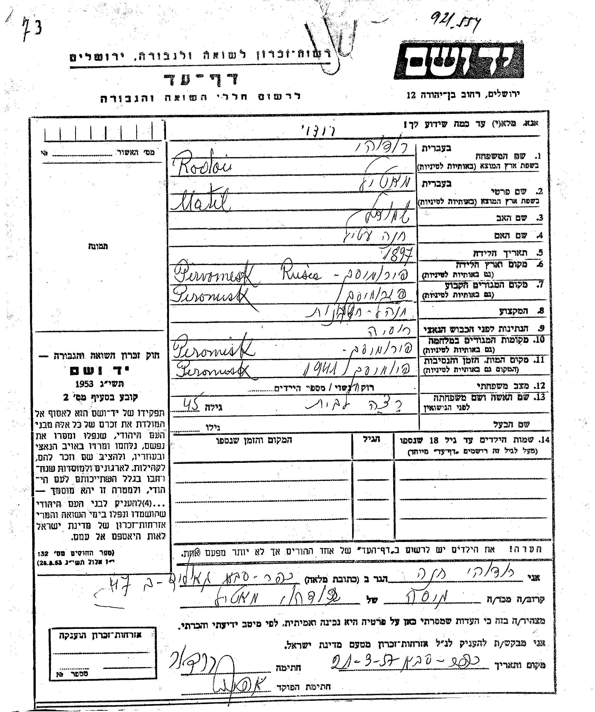 Matil Rodoi est né à Pervomaysk, Ukraine (URSS) en 1897, fils de Shmuel et de Khana Etil. Il était Comptable et Mariée à Ratza. Avant la seconde guerre mondiale il vivait à Pervomaysk, Ukraine (URSS). Au cours de la guerre, il était à Pervomaysk, Ukraine (URSS).