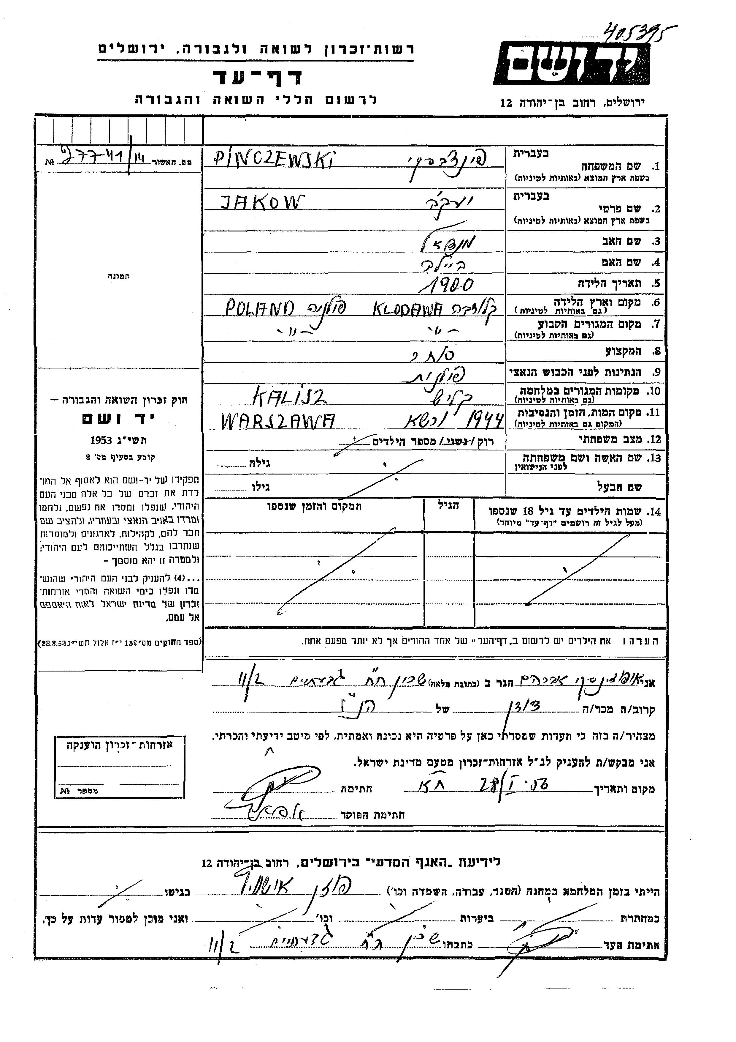 Pinczewski Jakow 1900 Klodawa, Pologne Feuille de témoignage