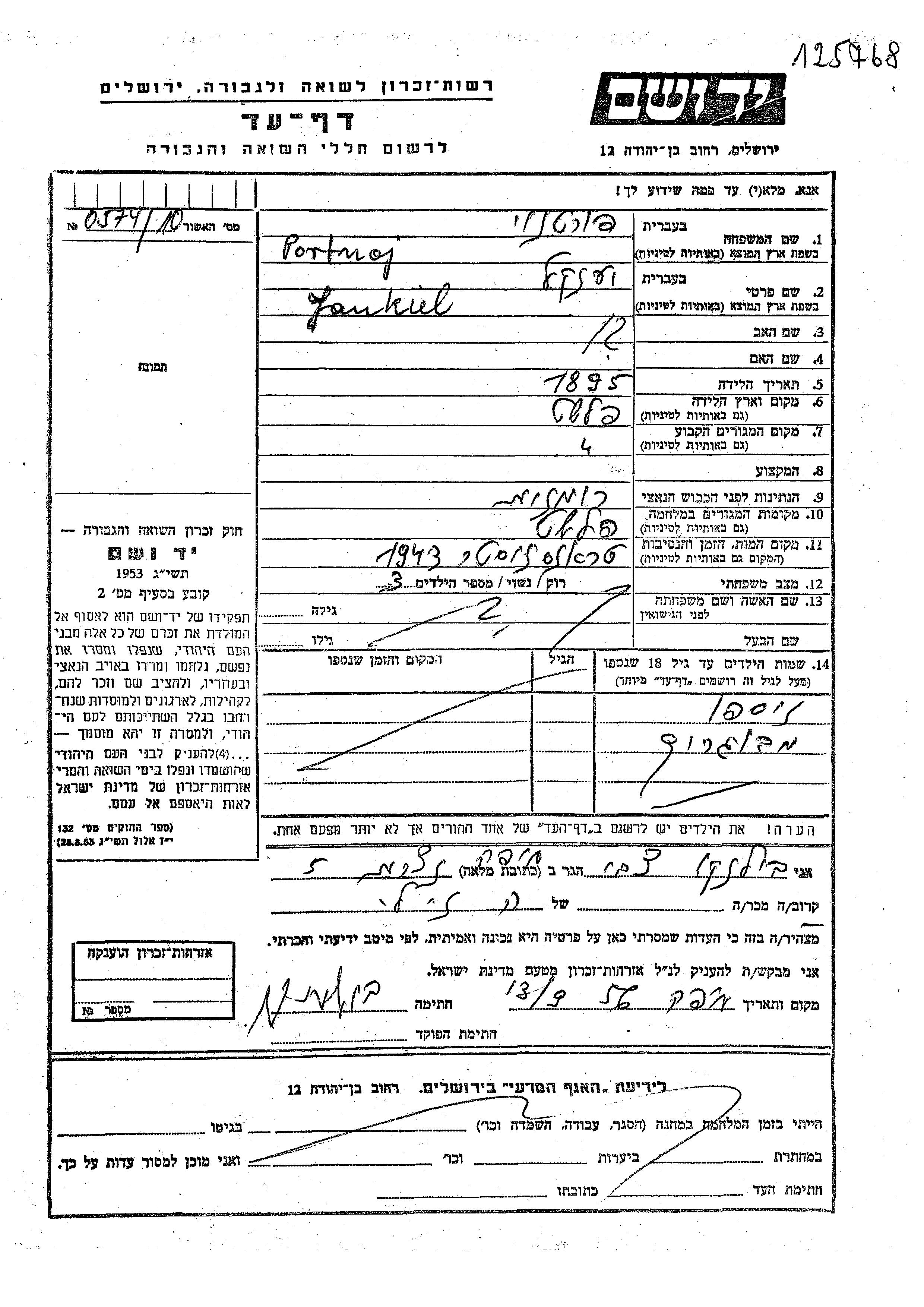 Yankul Portnoj est né à Falesti, Roumanie en 1895. Avant la seconde guerre mondiale il vivait à Falesti, Roumanie. Au cours de la guerre, il était à Falesti, Roumanie.