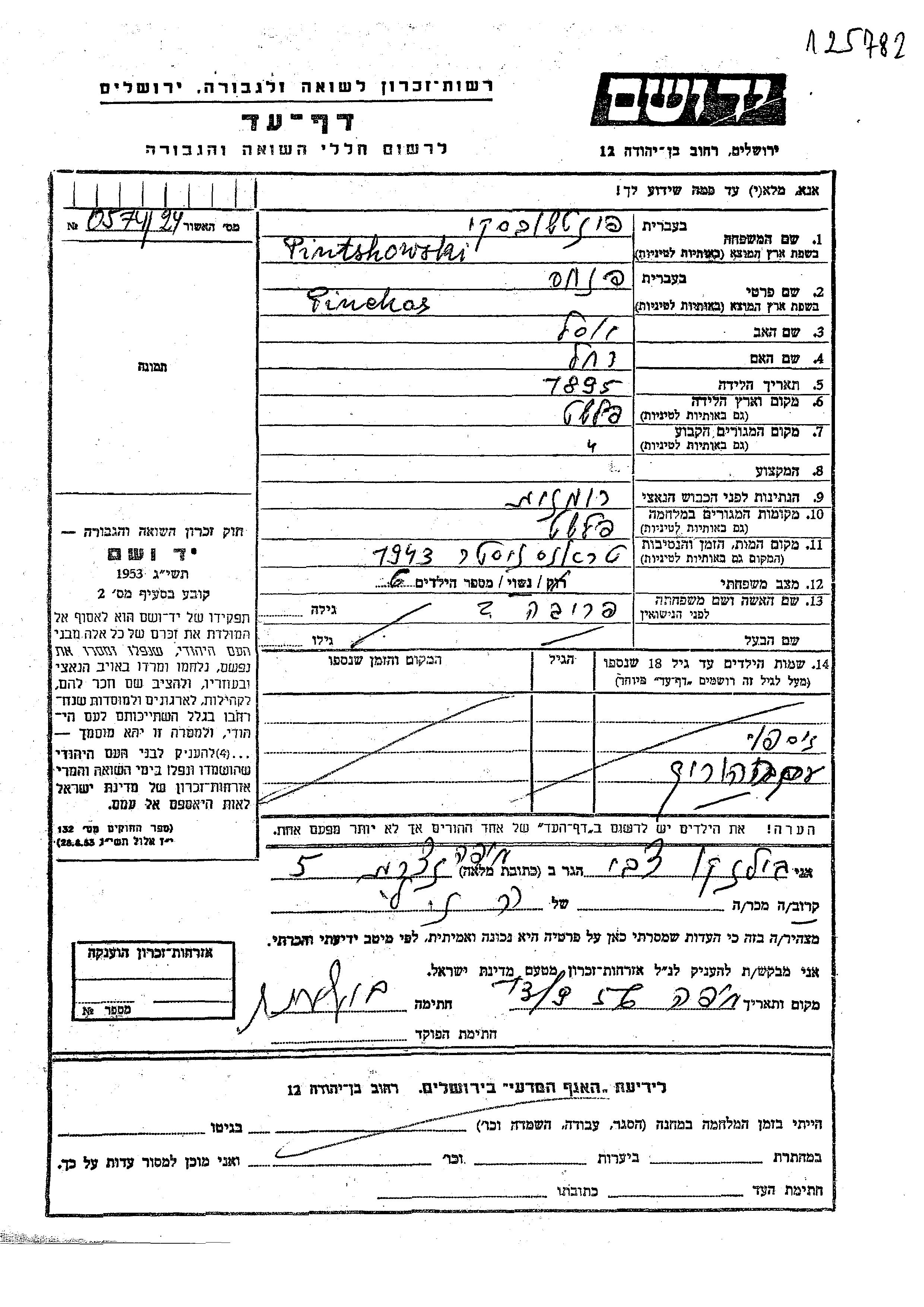 Pintshowski Pinchas 1895 Falesti, Roumanie Feuille de témoignage