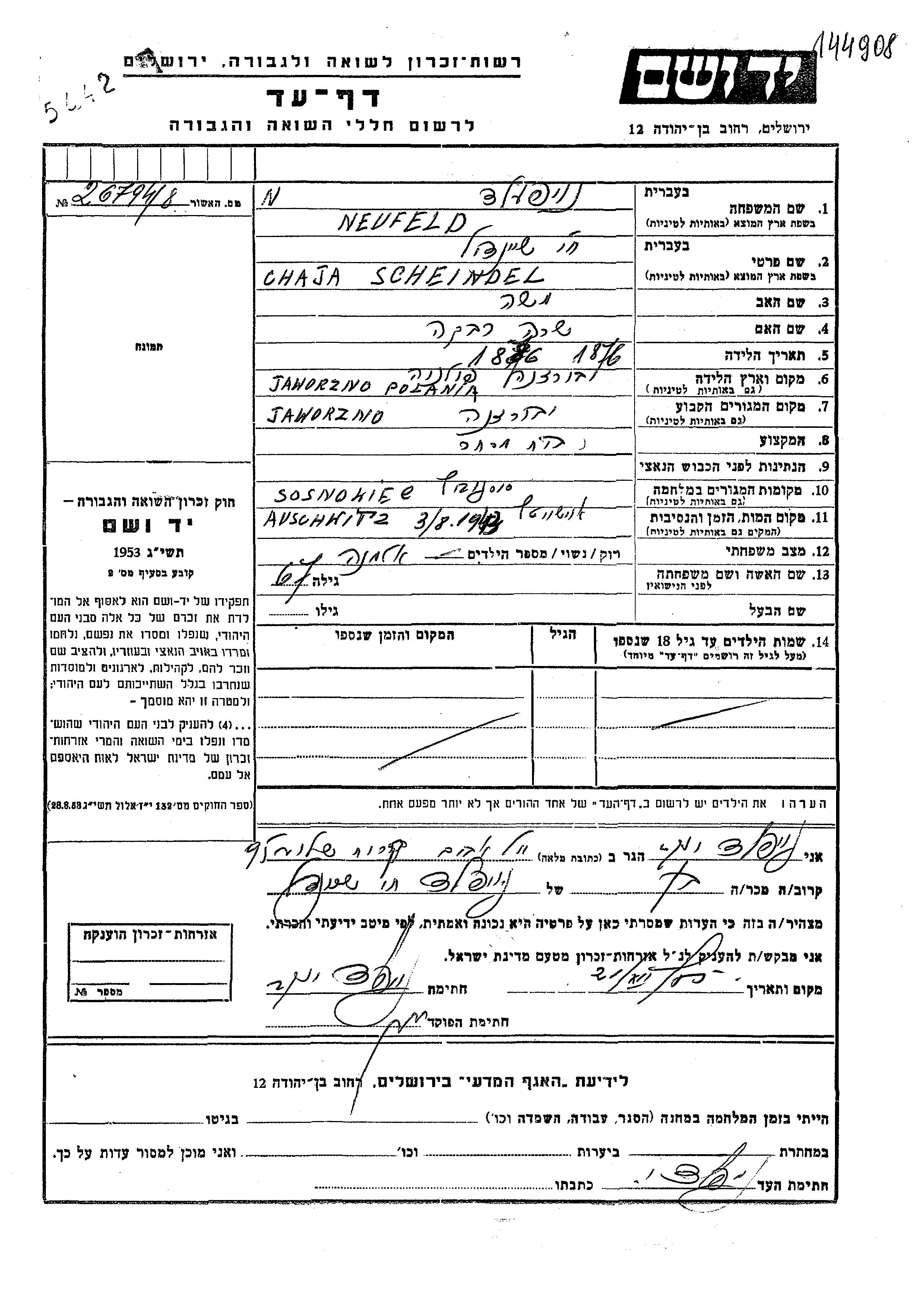 Chaja Scheindel Neufeld est née à Jaworzno, Pologne en 1876, fille de Moshe et de Sara Rivka. Elle était veuve. Avant la seconde guerre mondiale elle vivait à Jaworzno, Pologne. Pendant la guerre, elle était à Sosnowiec, Pologne.