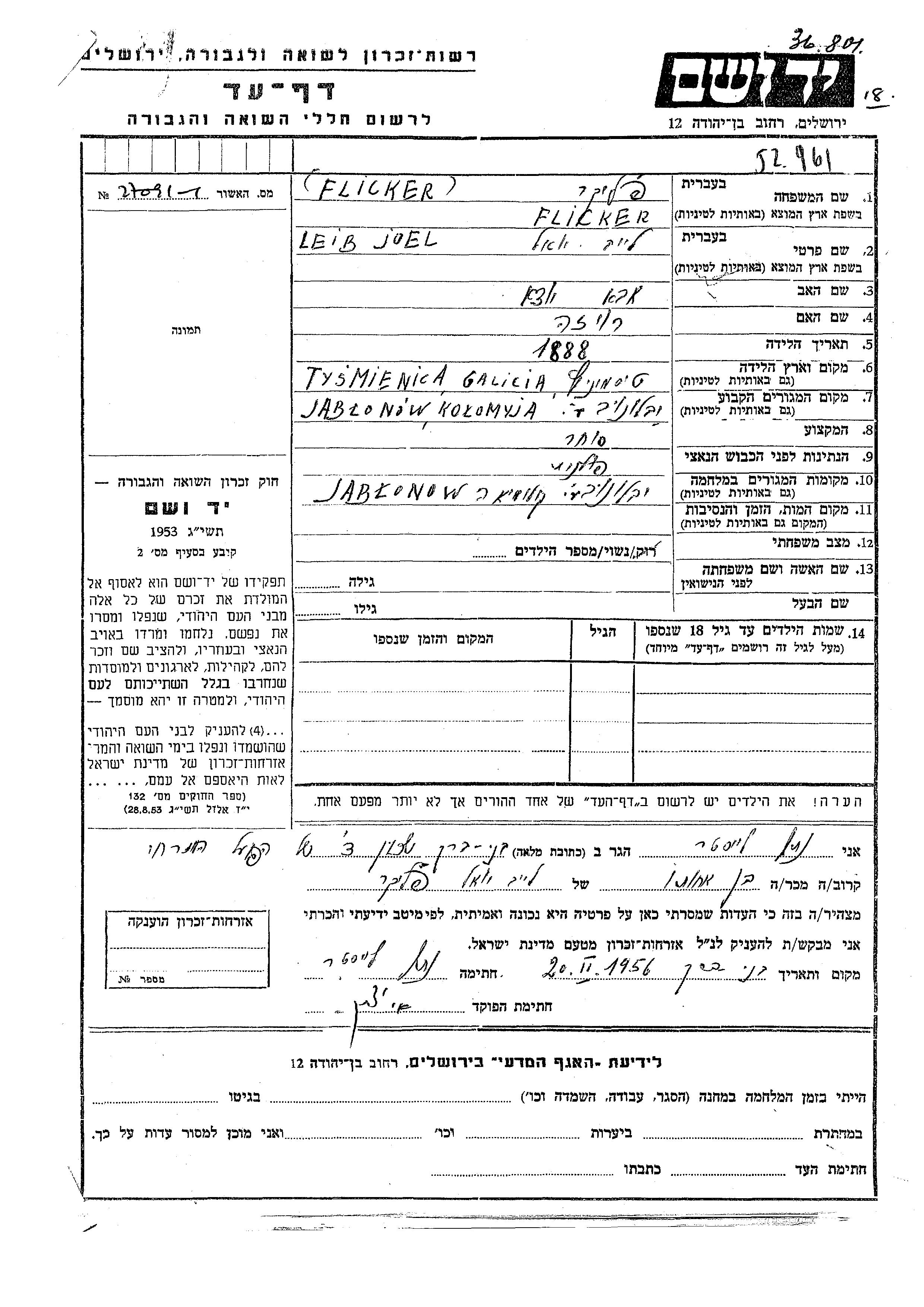 Joel Leib Flicker est né à Galicia Region, Pologne en 1888, fils de Aba Iuda et de Roiza. Il était Commerçant/e et Marié. Avant la seconde guerre mondiale il vivait à Jablonow, Pologne. Au cours de la guerre, il était à Jablonow, Pologne.