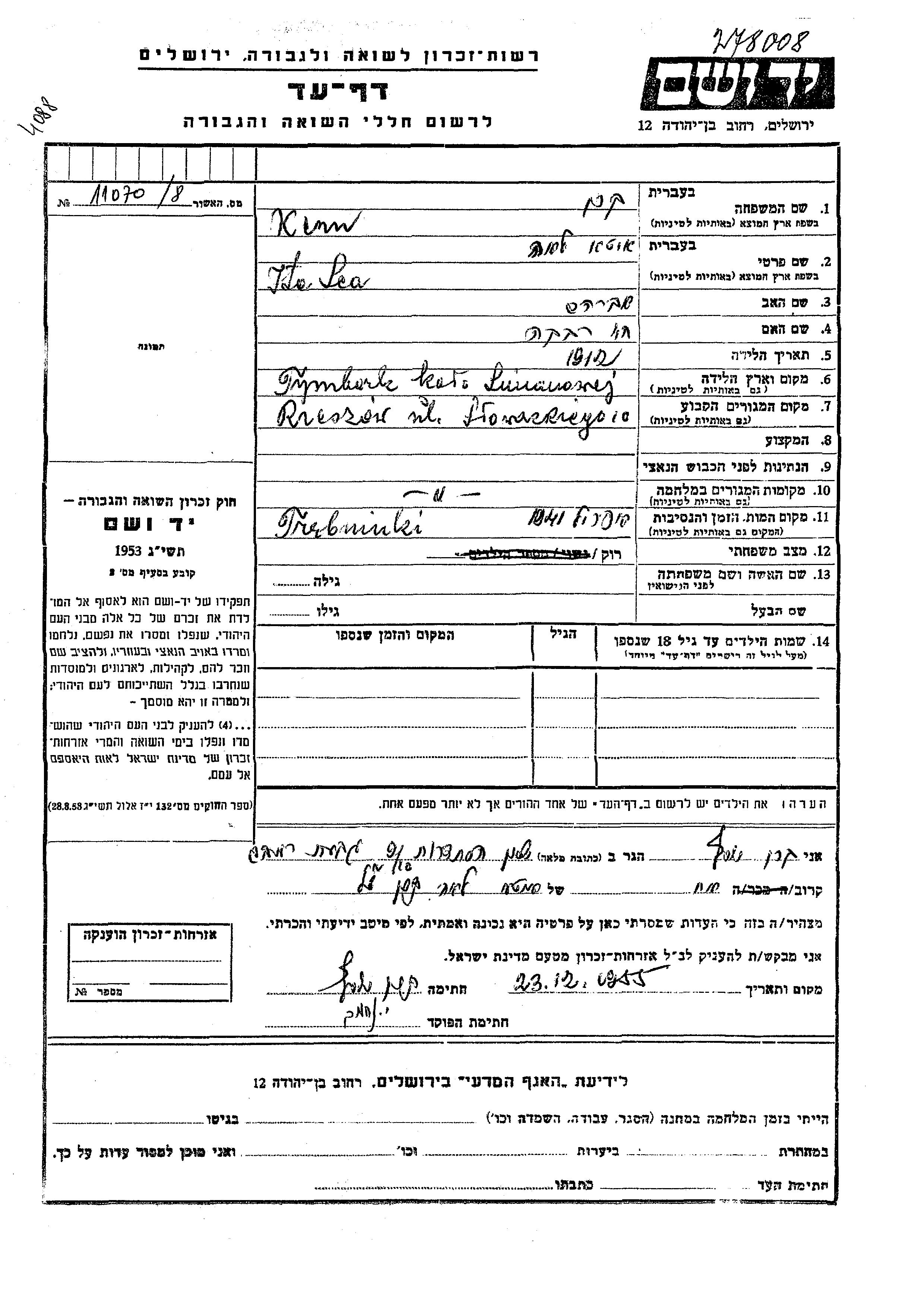 Yad Vashem - Pages of Testimony Names Memorial Collection