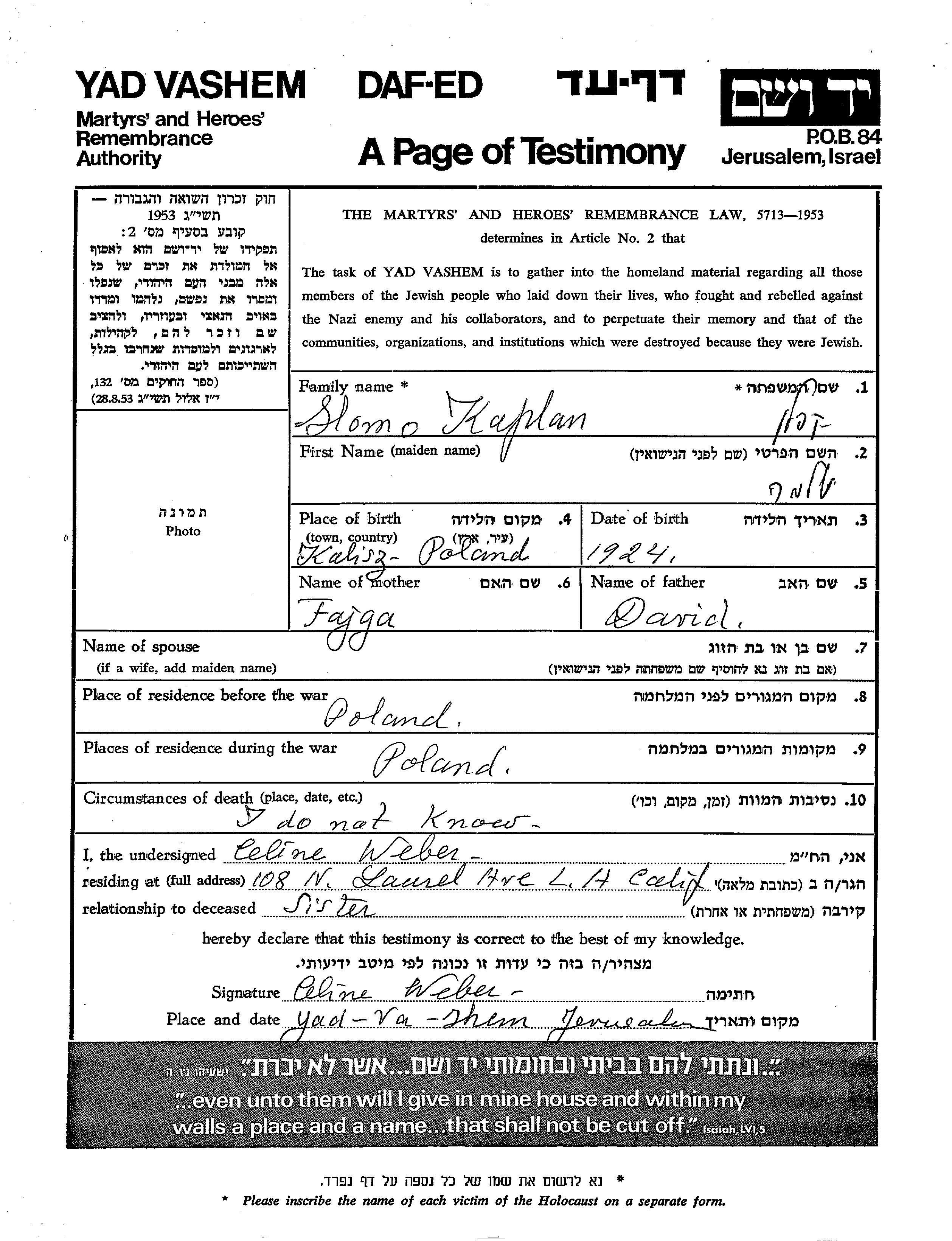 Slomo Kaplan est né à Kalisz, Pologne en 1924, fils de David et de Fajga. Avant la seconde guerre mondiale il vivait à Pologne. Au cours de la guerre, il était à Pologne.