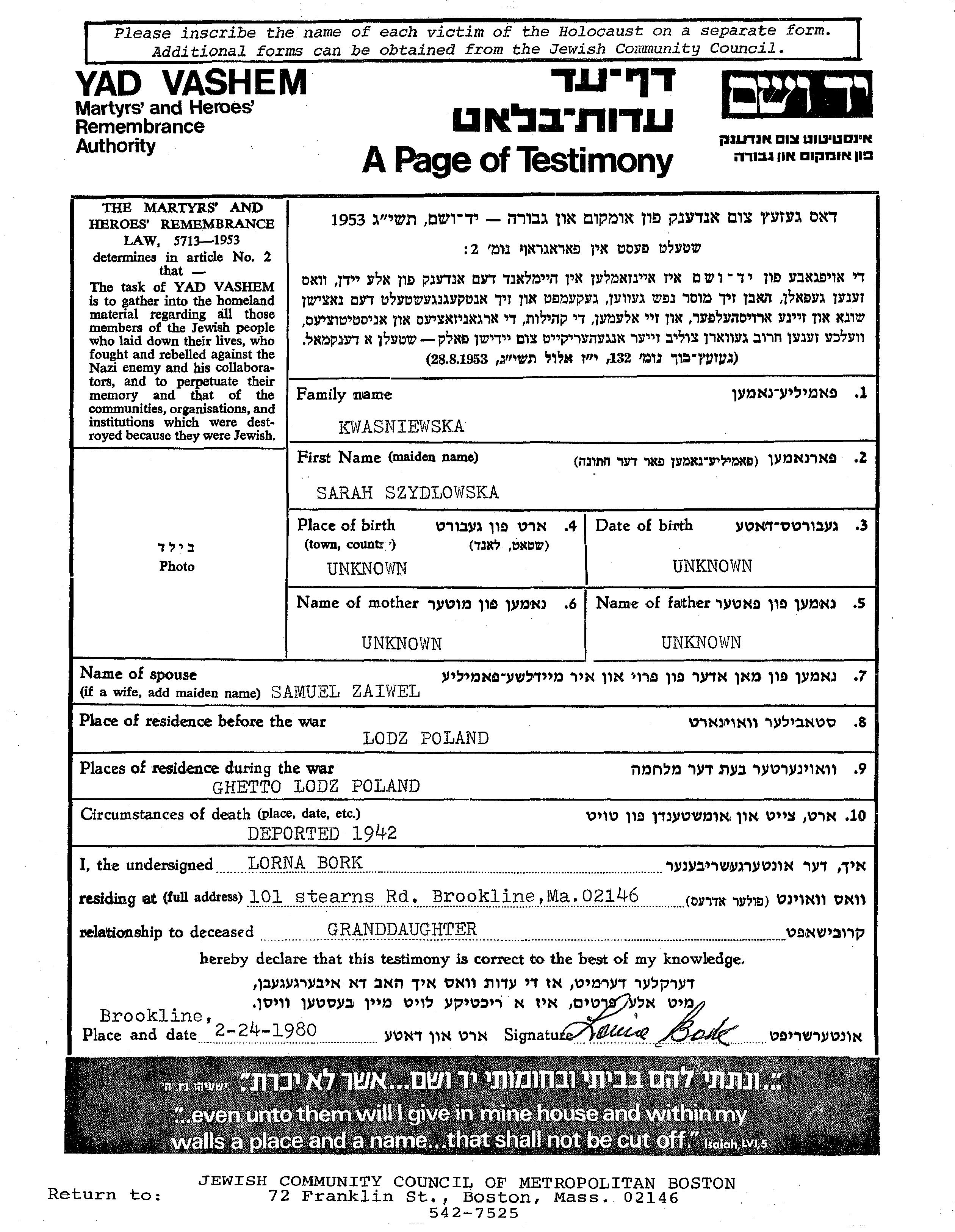 Sarah Kwasniewska née Szydlowska. Elle était Mariée à Zaiwel. Avant la seconde guerre mondiale elle vivait à Lodz, Pologne. Pendant la guerre, elle était à Lodz, Pologne.