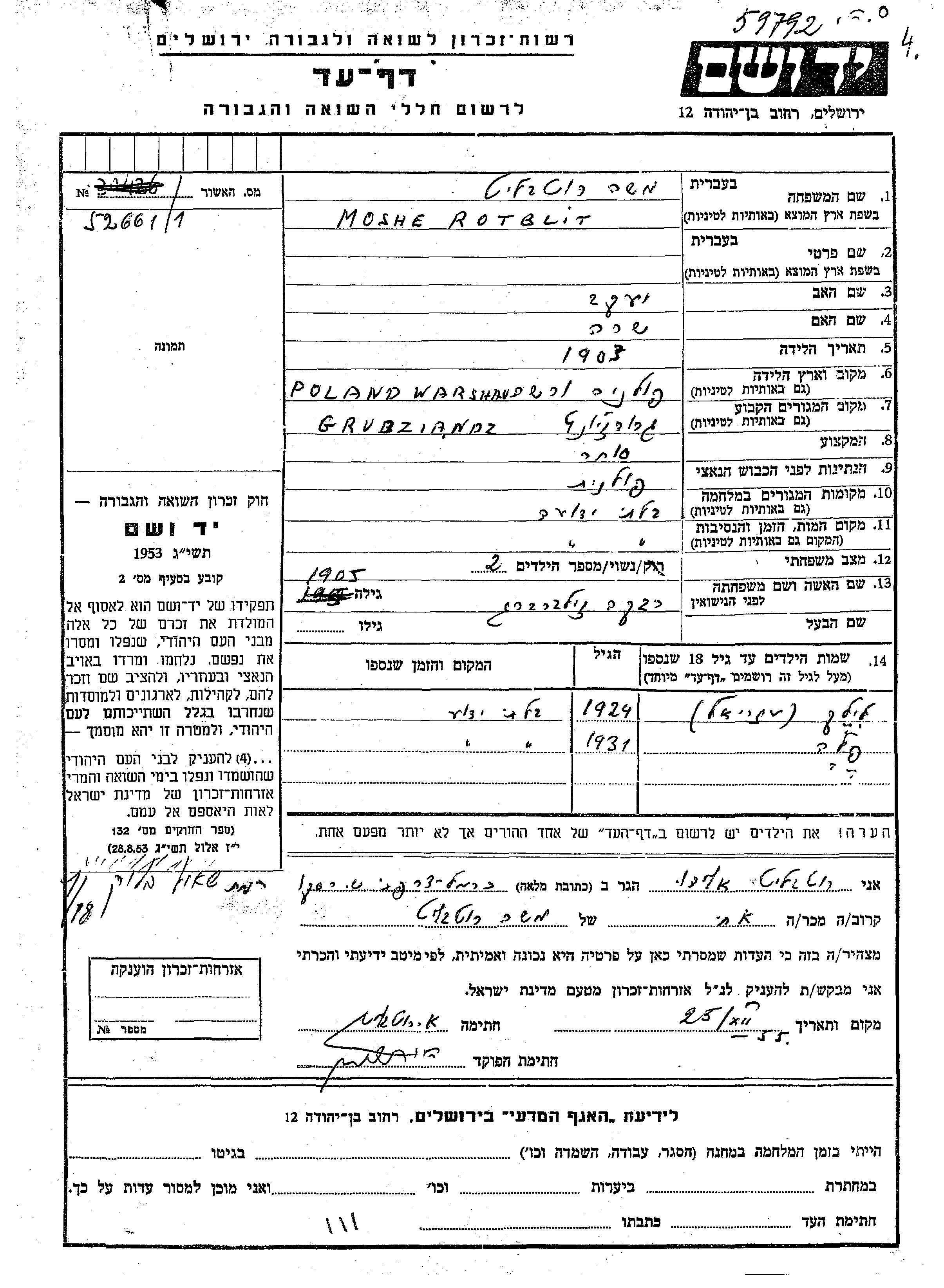 Rotblit Moshe 1903 Grudziadz, Pologne Feuille de témoignage