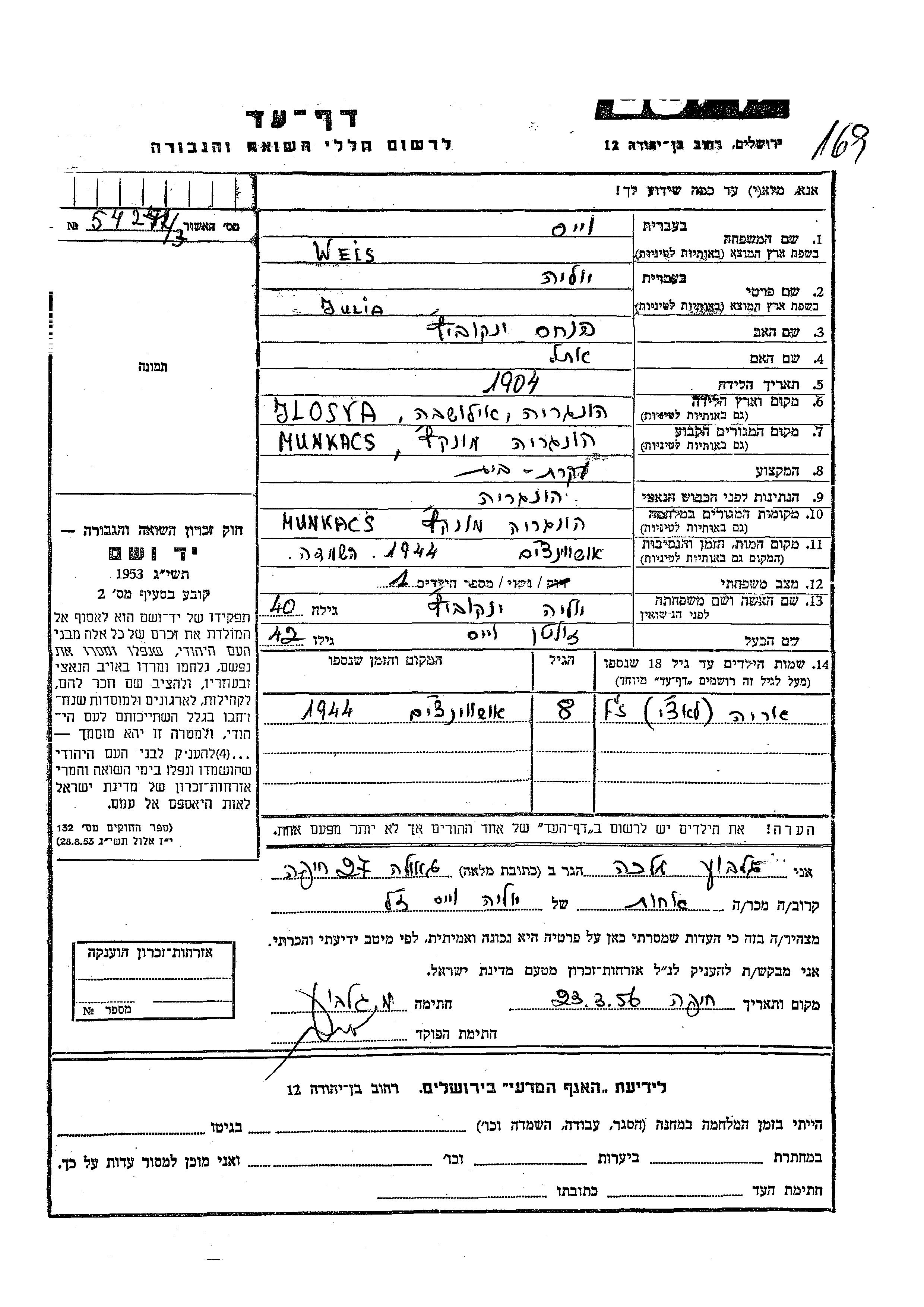 Weis Yulia 1904 Munkacs, Tchécoslovaquie Feuille de témoignage