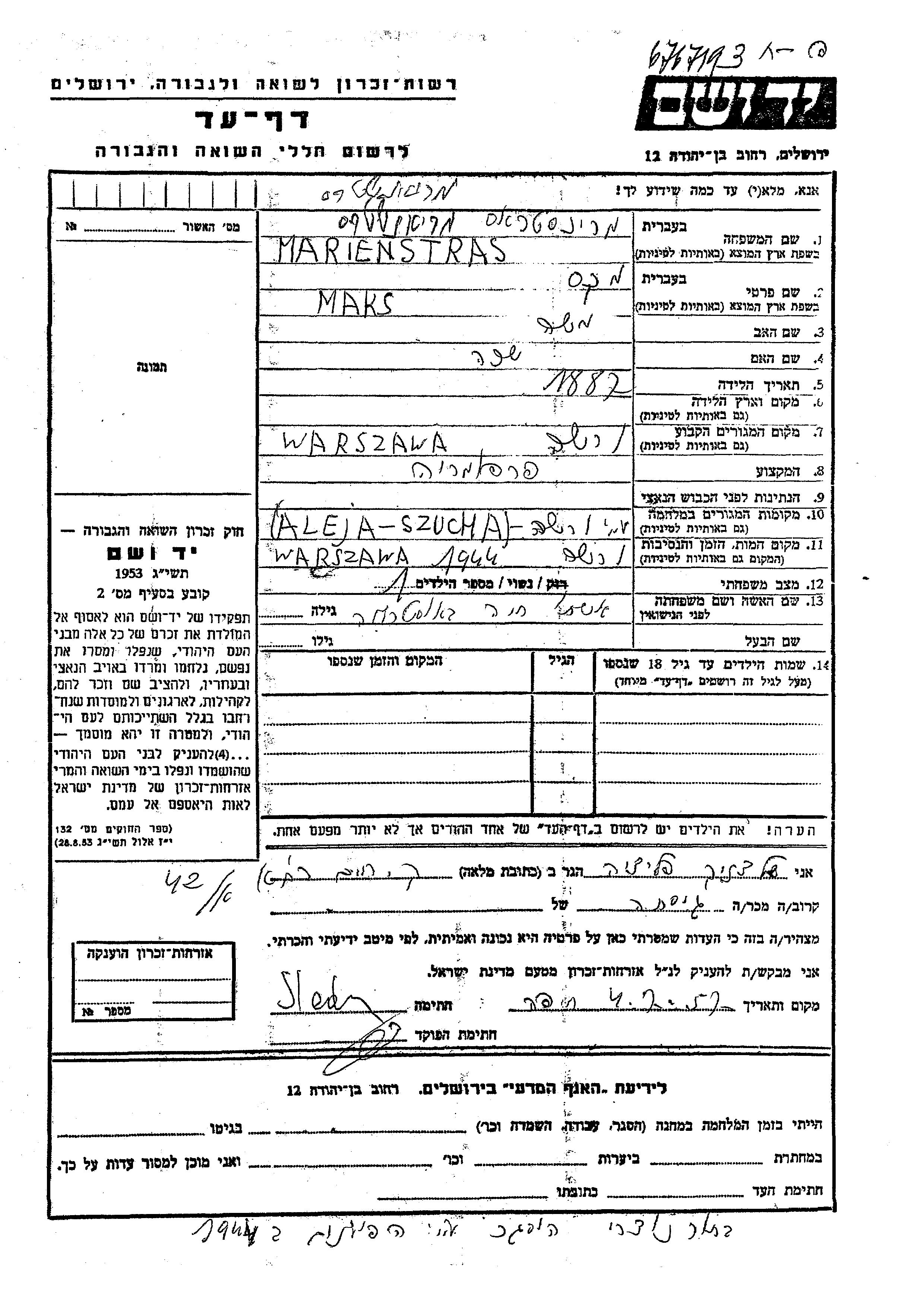 Max Marienstrass est né en 1887, fils de Moshe et de Sara. Il était Marié. Avant la seconde guerre mondiale il vivait à Warszawa, Pologne. Au cours de la guerre, il était à Warsaw, Pologne.