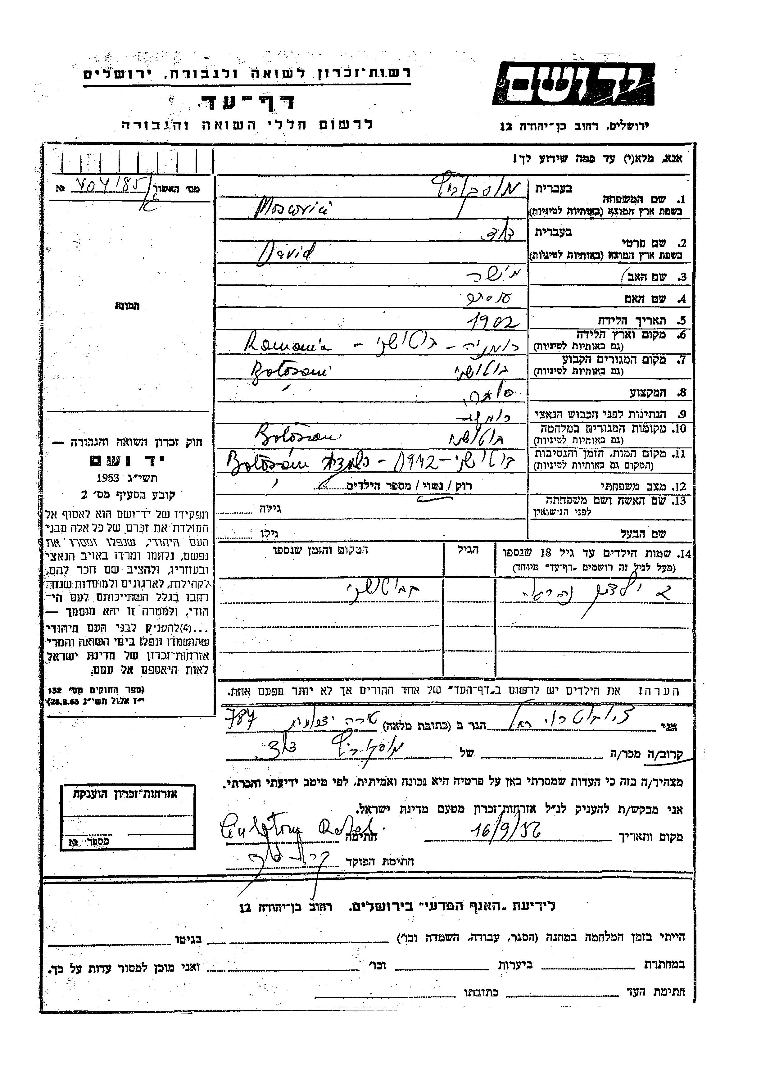 Moscovici David 1902 Botosani, Roumanie Feuille de témoignage