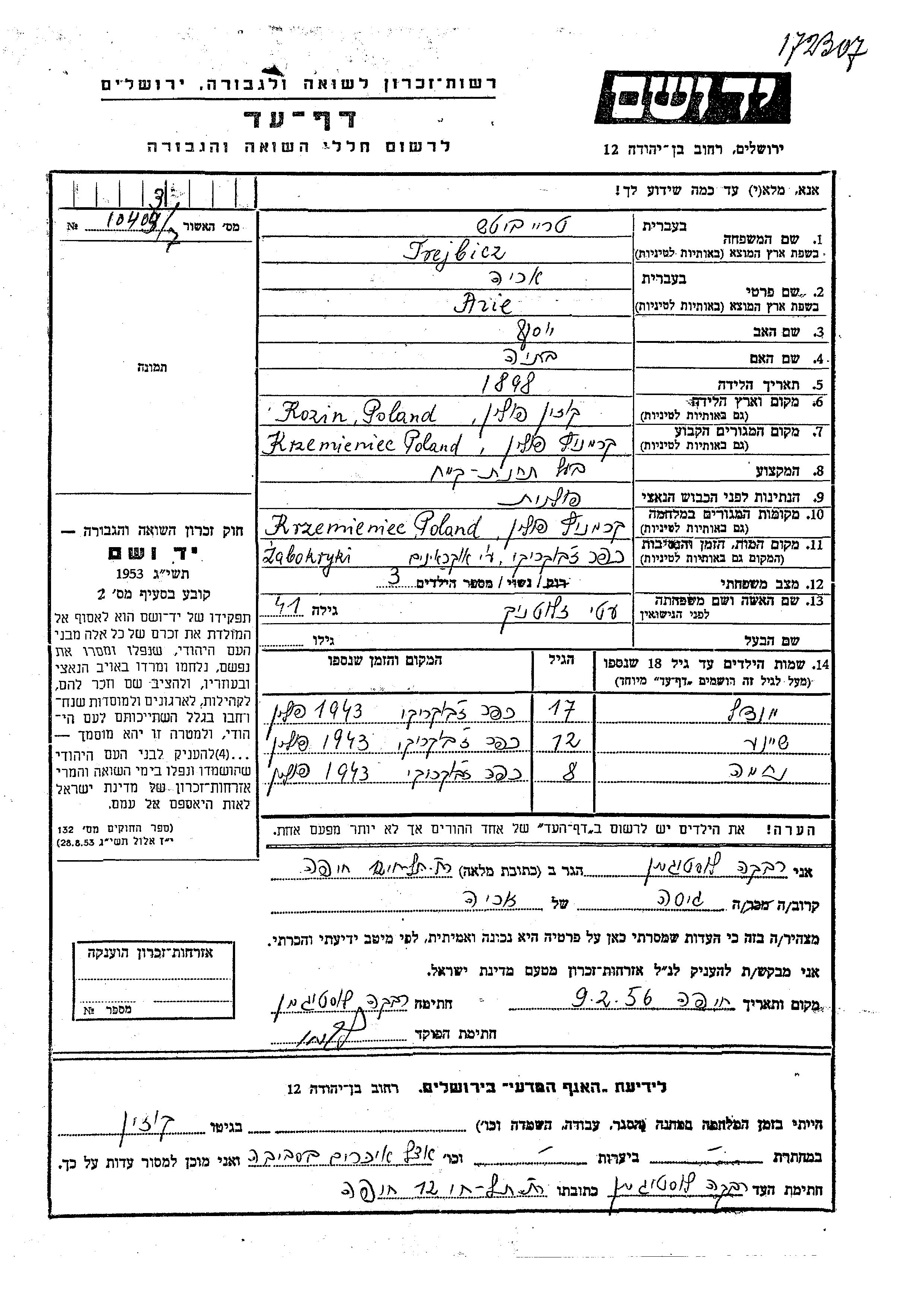 Arie Trejbicz est né à Kozin, Pologne en 1898, fils de Yosef et de Batia. Il était Propriétaire d'un moulin et Mariée à Eti née Zlotnik. Avant la seconde guerre mondiale il vivait à Krzemieniec, Pologne. Au cours de la guerre, il était à Krzemieniec, Pologne.