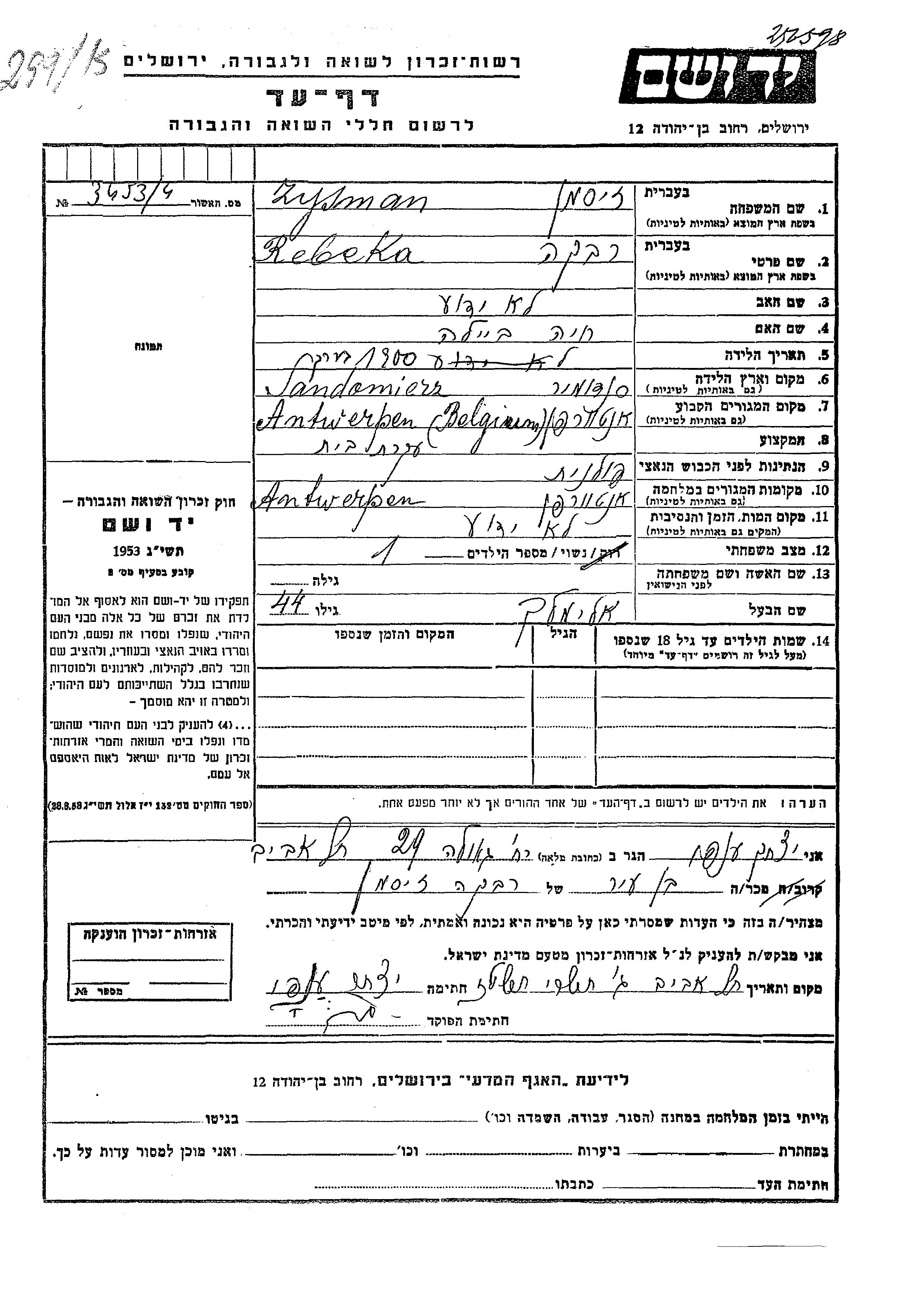 Zysman Rebeka 1900 Antwerpen, Belgique Feuille de témoignage