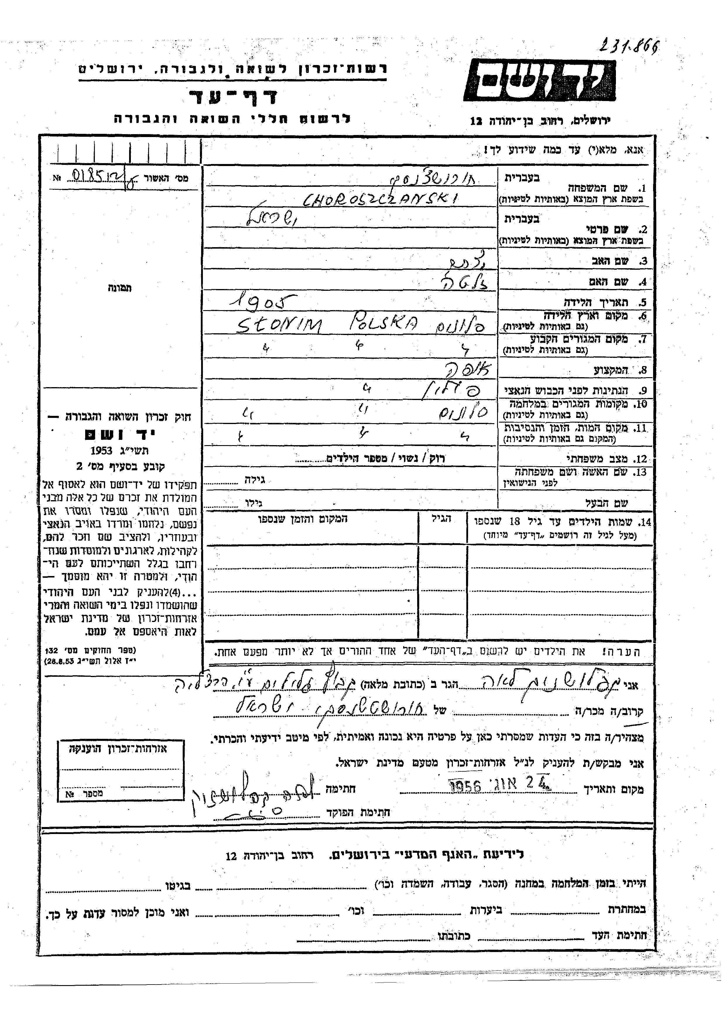 Choroszczanski Yisrael 1905 Slonim, Pologne Feuille de témoignage