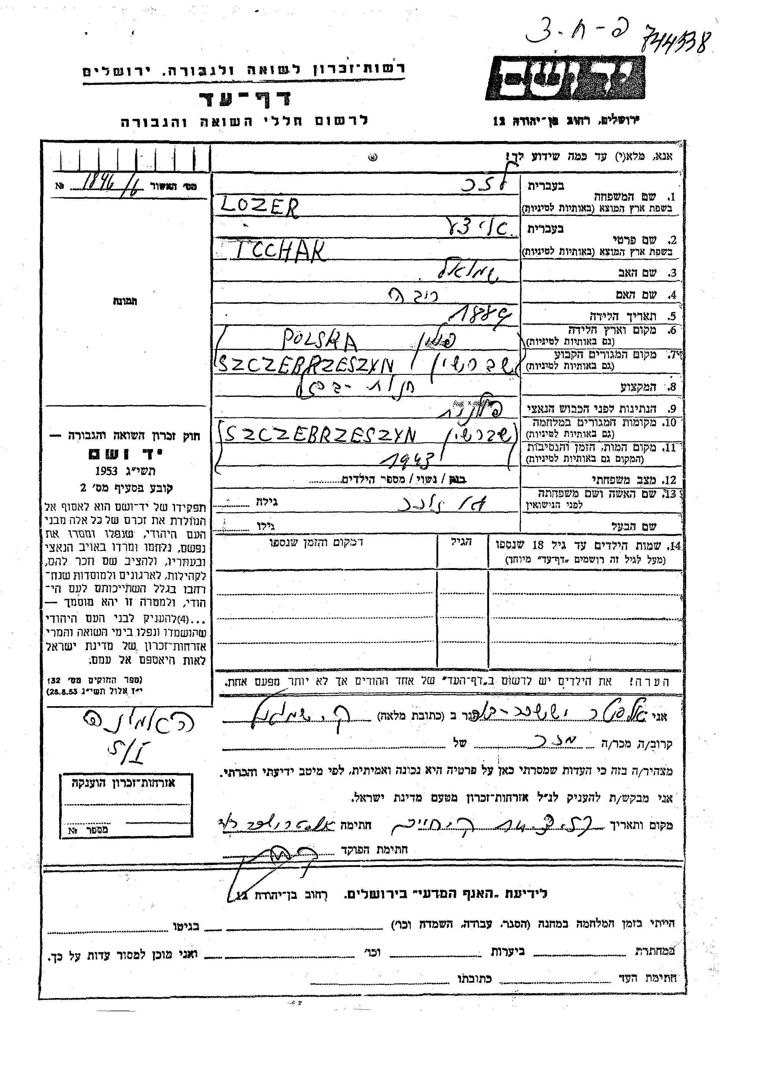 Lozer Lazar Icchak 1889 Szczebrzeszyn, Pologne Feuille de témoignage