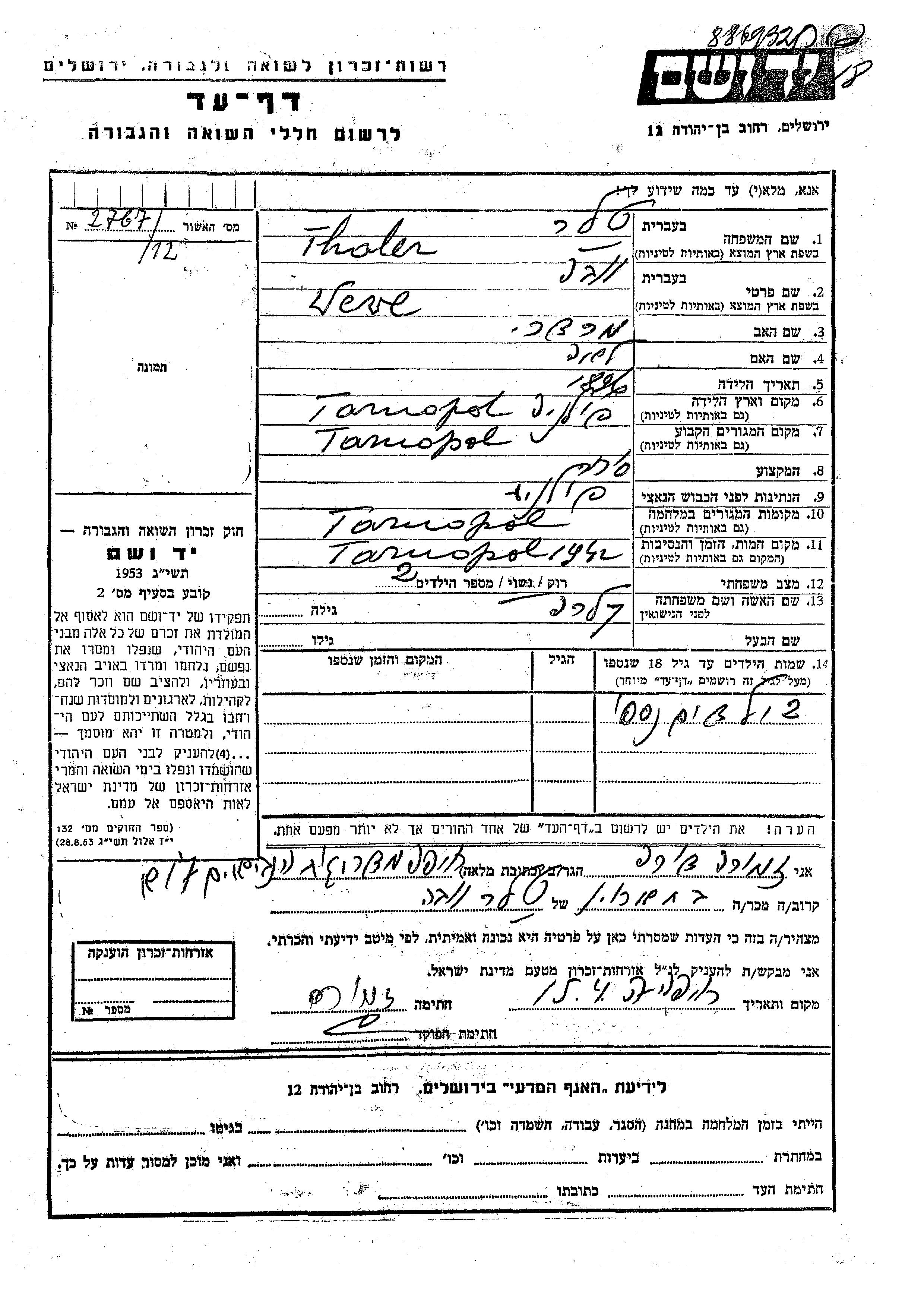 Yad Vashem - Pages of Testimony Names Memorial Collection
