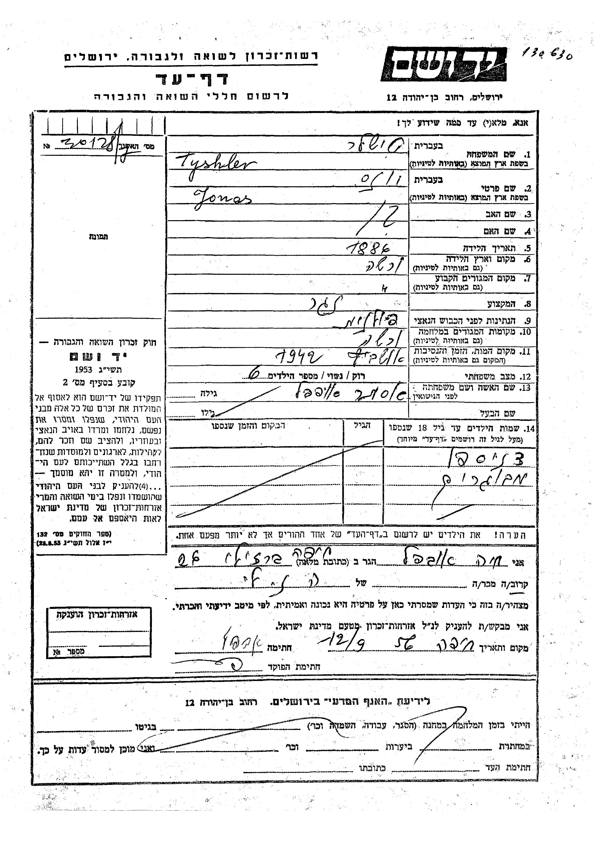 Jones Tyshler est né à Warsaw, Pologne en 1886. Il était Charpentier et Mariée à Ester née Ubfal. Avant la seconde guerre mondiale il vivait à Warsaw, Pologne. Au cours de la guerre, il était à Warsaw, Pologne.
