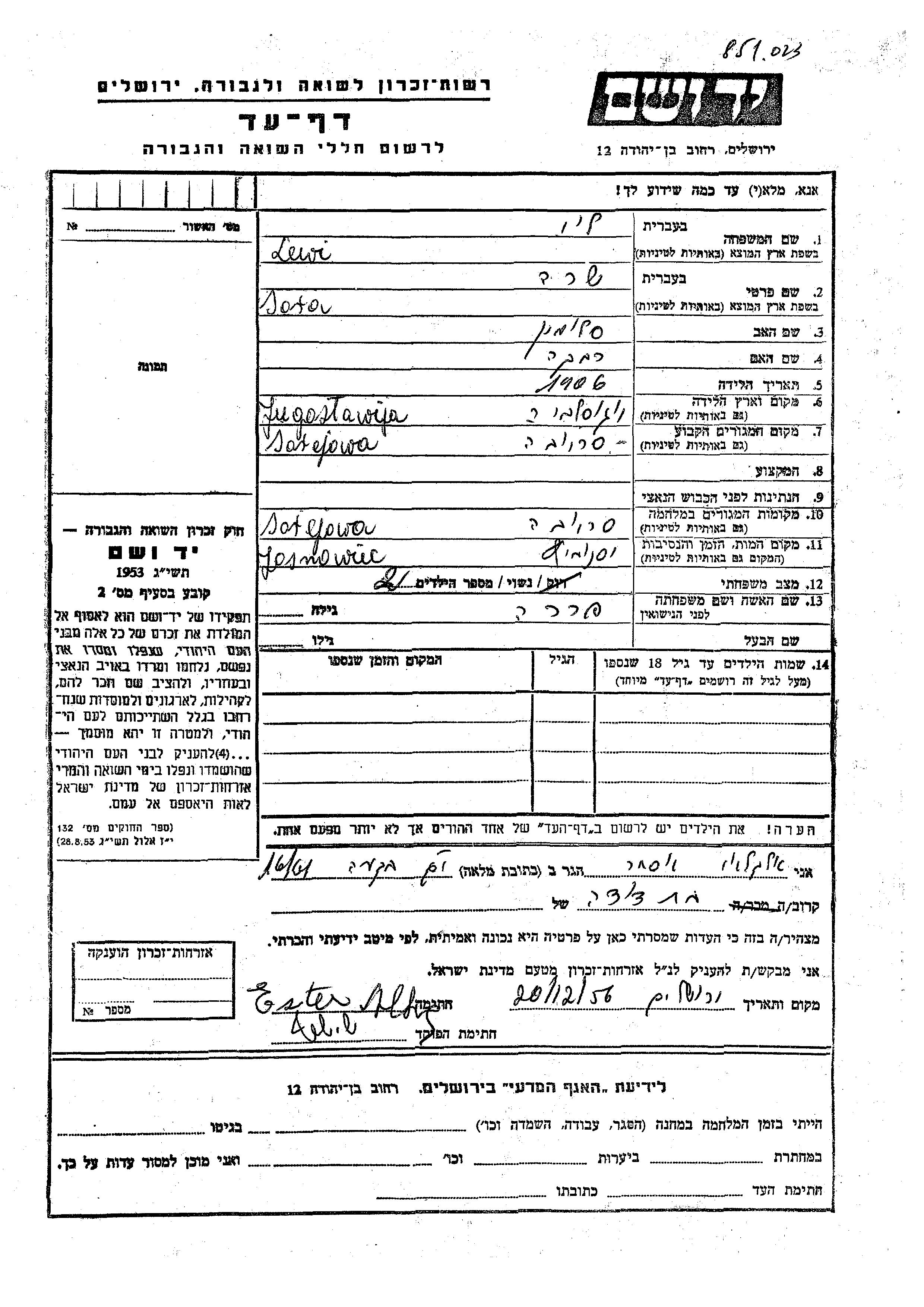 Lewi Sara 1906 Sarajevo, Yugoslavie Feuille de témoignage