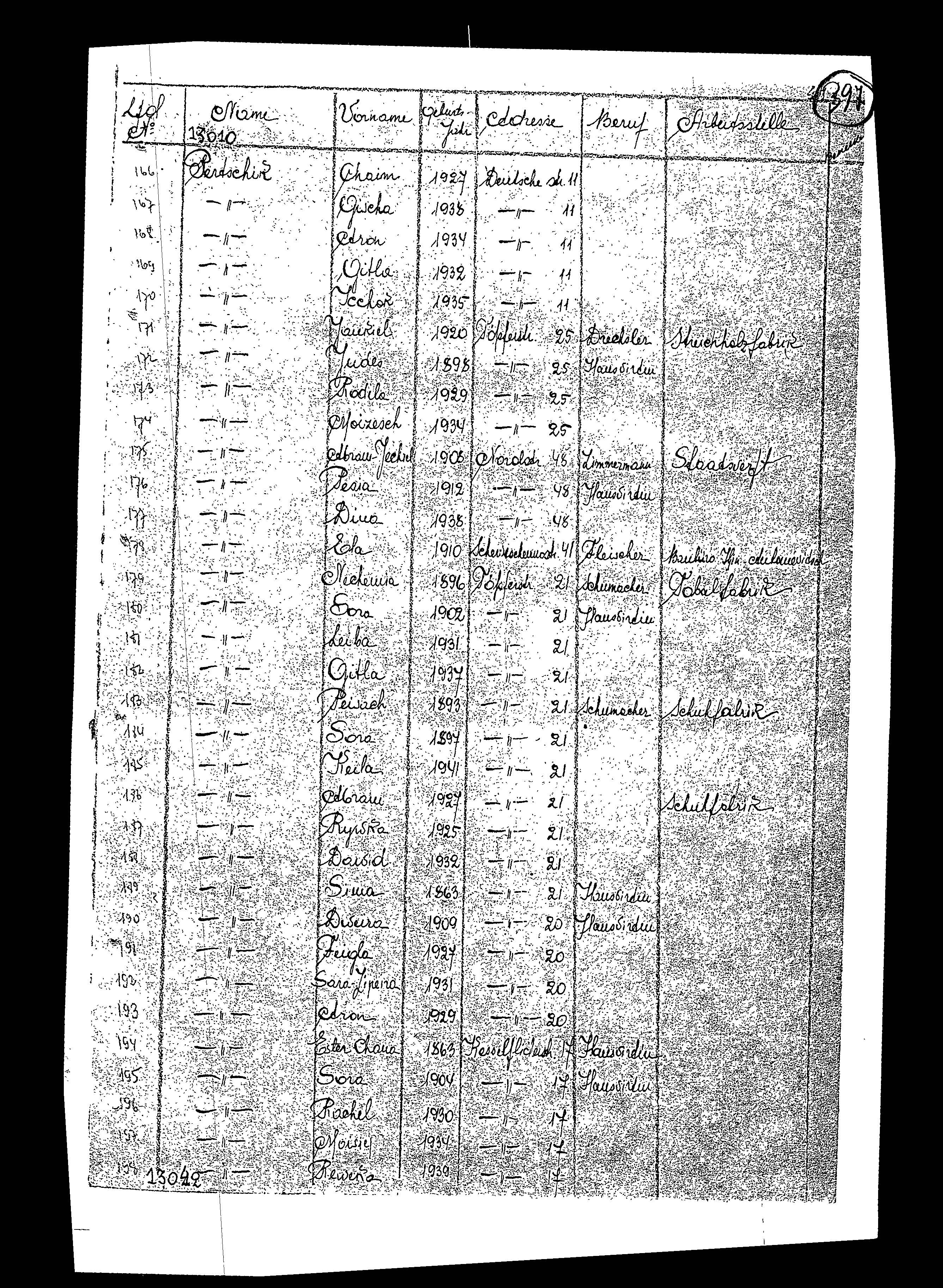 Sara Zipeira Pertschik est née en 1931. Elle était Enfant. Pendant la guerre, elle était à Pinsk, Pologne. Sara Zipeira a été présumément assassinée à la Shoah.