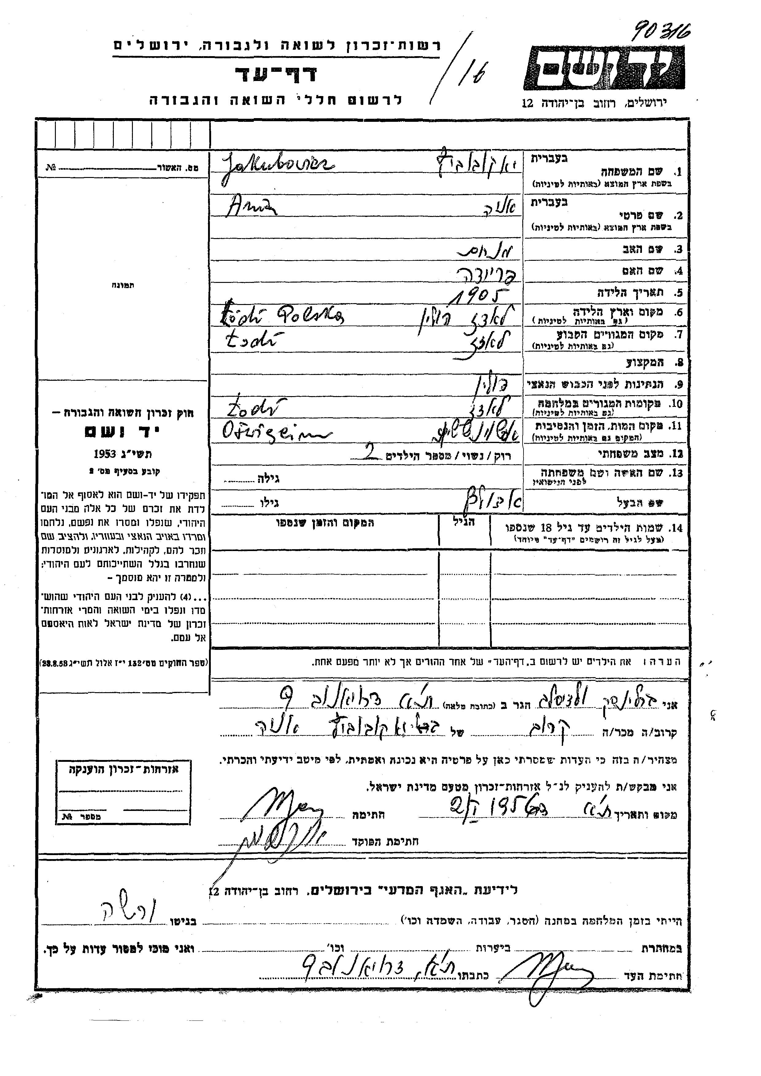Jakubovicz Ania 1905 Lodz, Pologne Feuille de témoignage