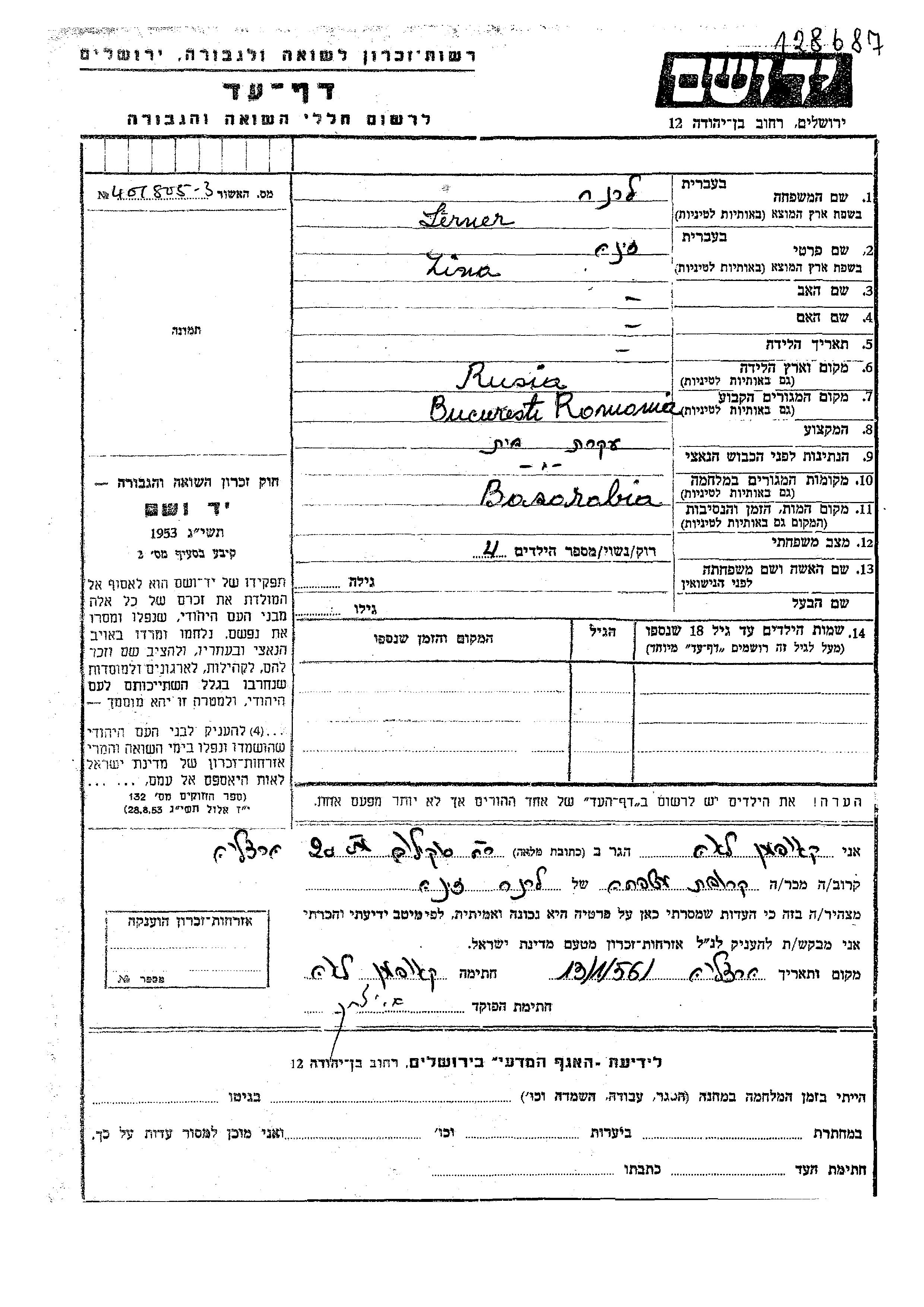 Zina Lerner est née à Russie (URSS). Elle était Femme au foyer et Mariée. Avant la seconde guerre mondiale elle vivait à Bucuresti, Roumanie. Pendant la guerre, elle était à Bessarabia, Roumanie.