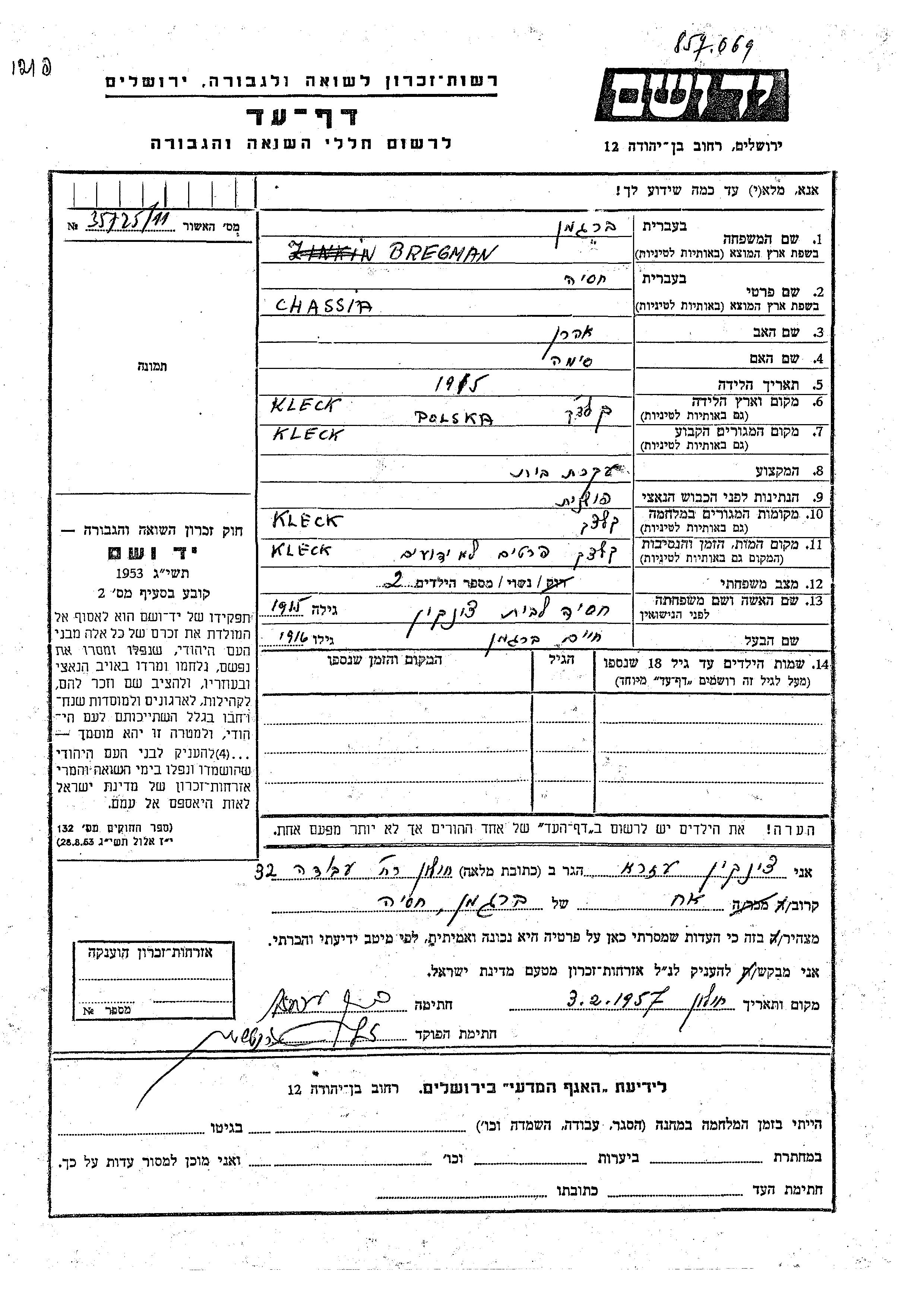 Bregman Bergman Chassia 1915 Kleck, Pologne Feuille de témoignage