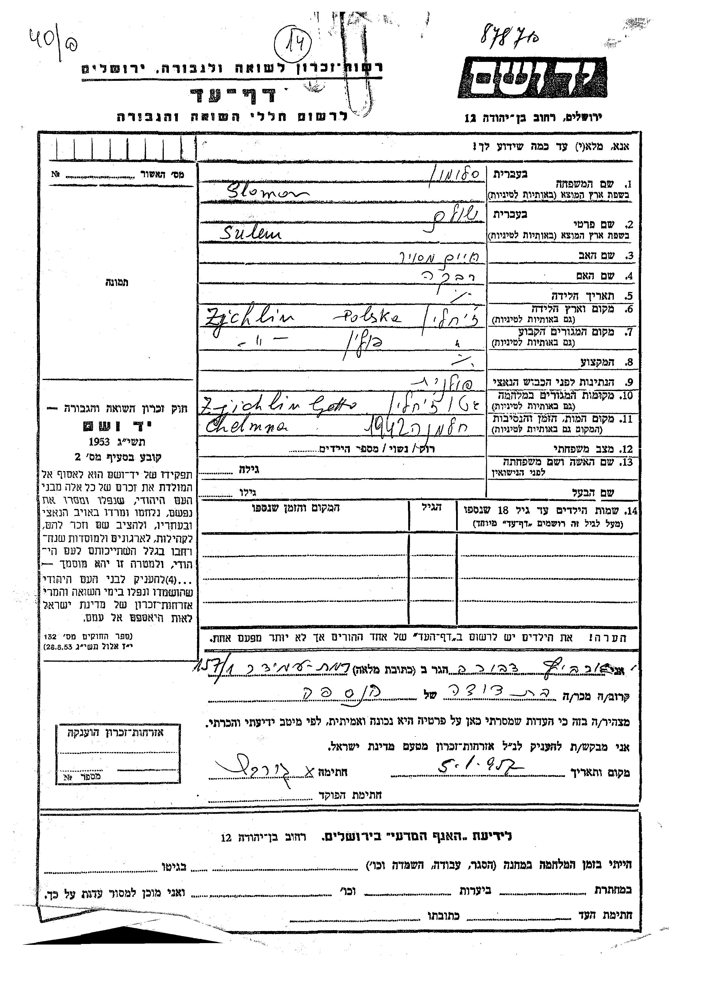 Sulem Slomon Salomon est né à Zychlin, Pologne, fils de Khaim Meir et de Rivka. Avant la seconde guerre mondiale il vivait à Zychlin, Pologne. Au cours de la guerre, il était à Zychlin, Pologne.
