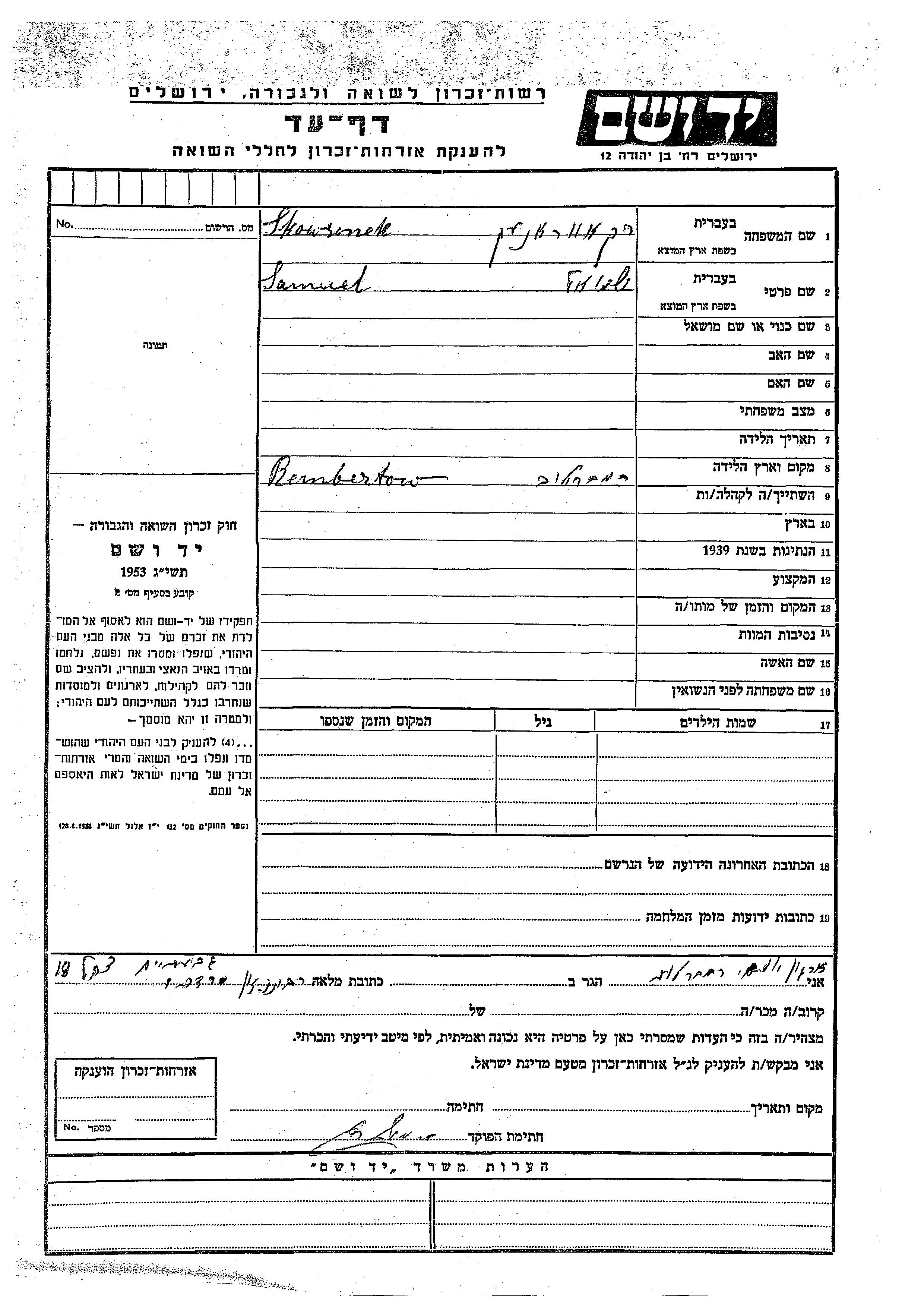 Skowronek Shmuel endroit inconnu, Feuille de témoignage