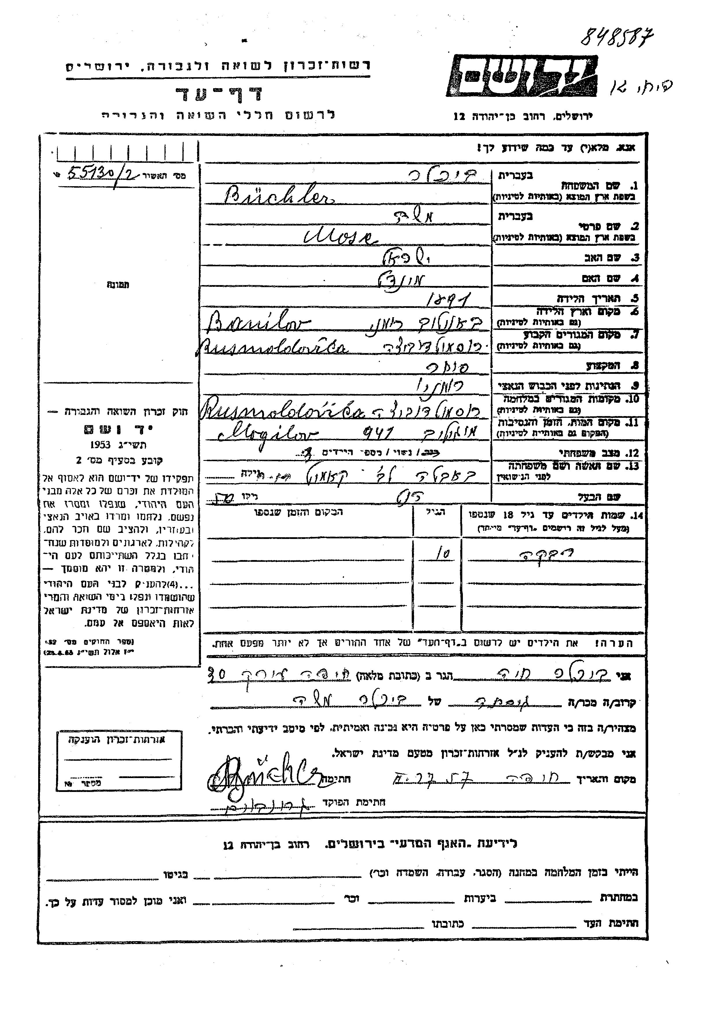 Buchler Bikhler Rivka Rus Moldovita, Roumanie Feuille de témoignage