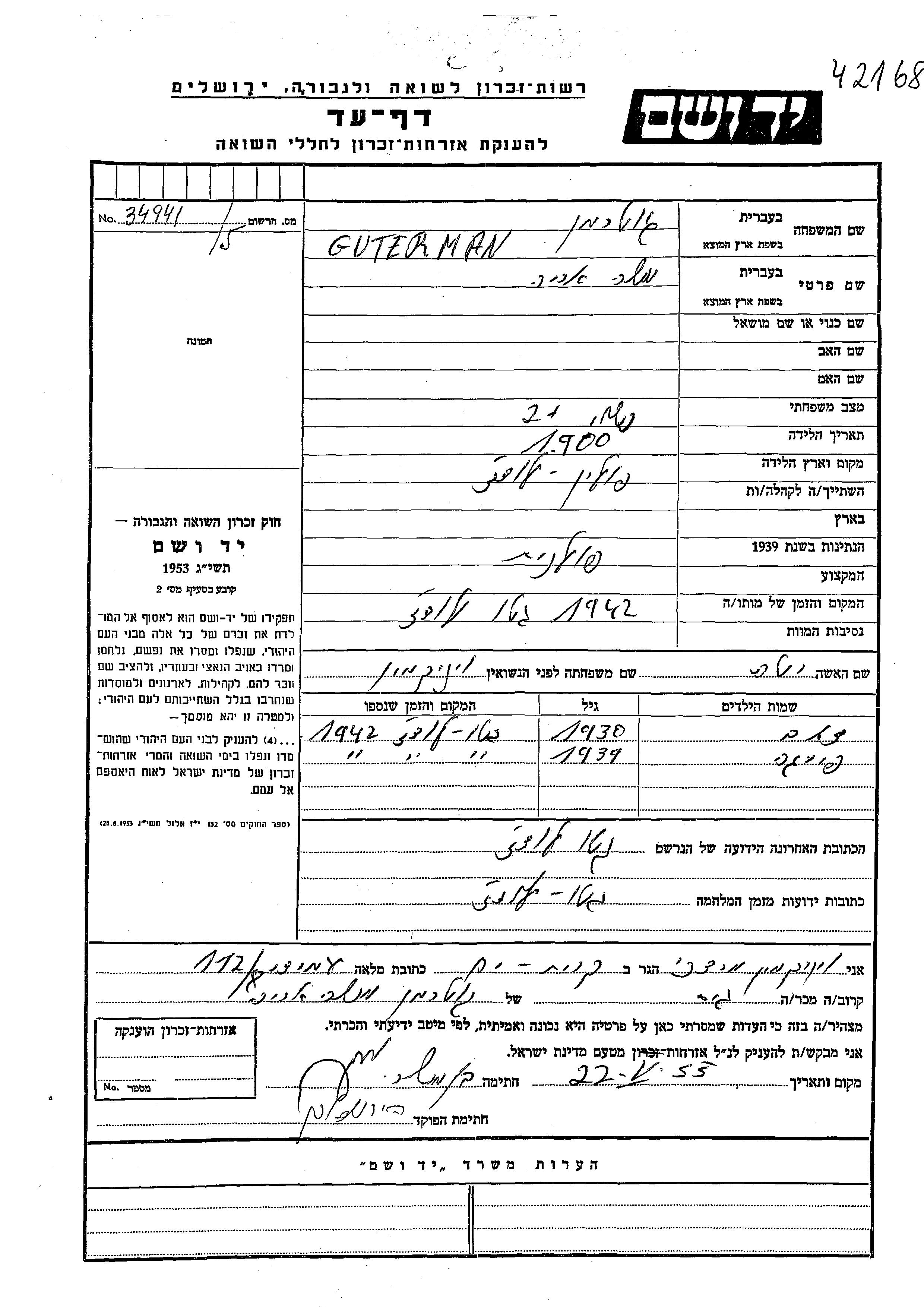 Guterman Zeev 1930 endroit inconnu, Feuille de témoignage