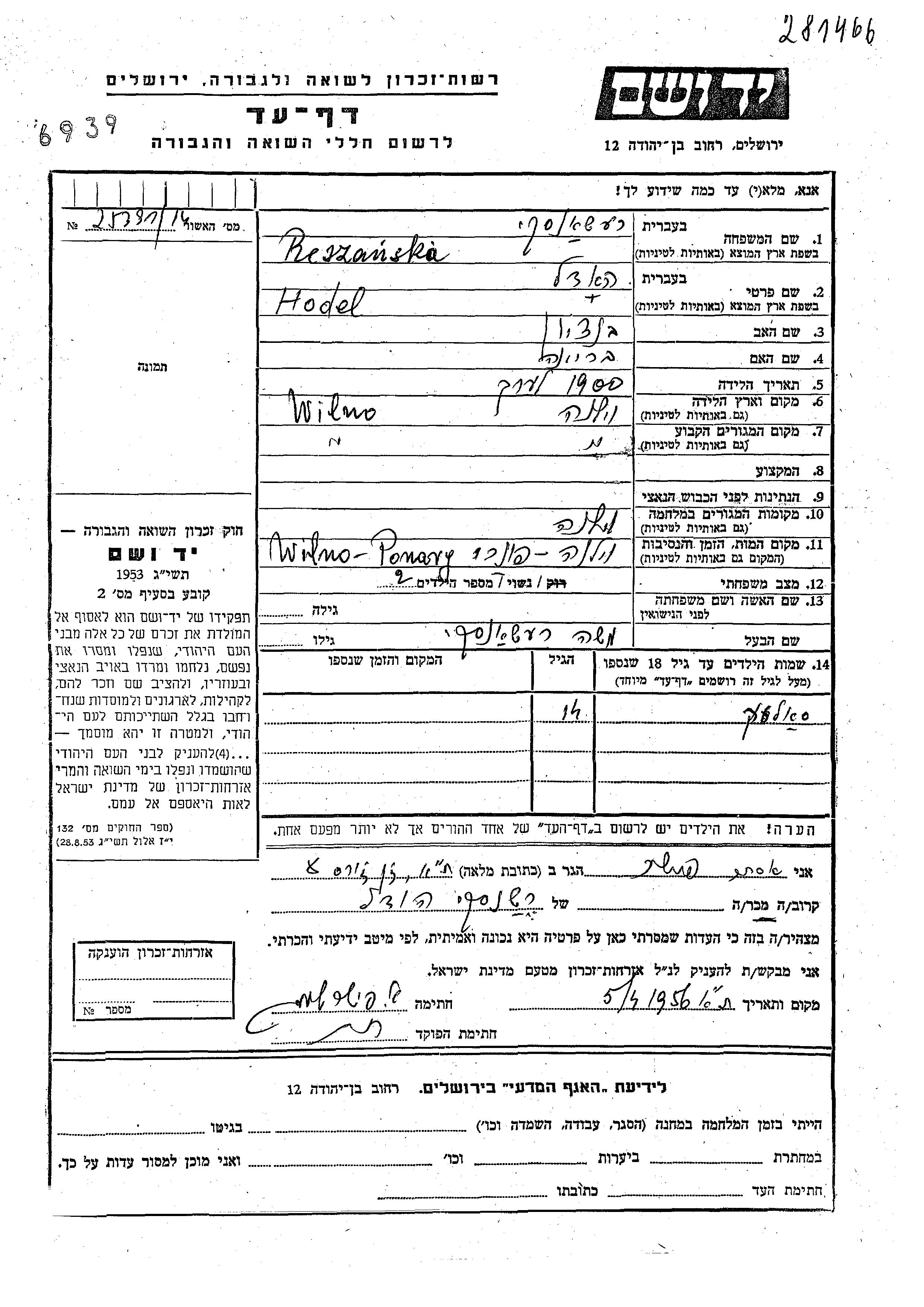 Yad Vashem - Pages of Testimony Names Memorial Collection