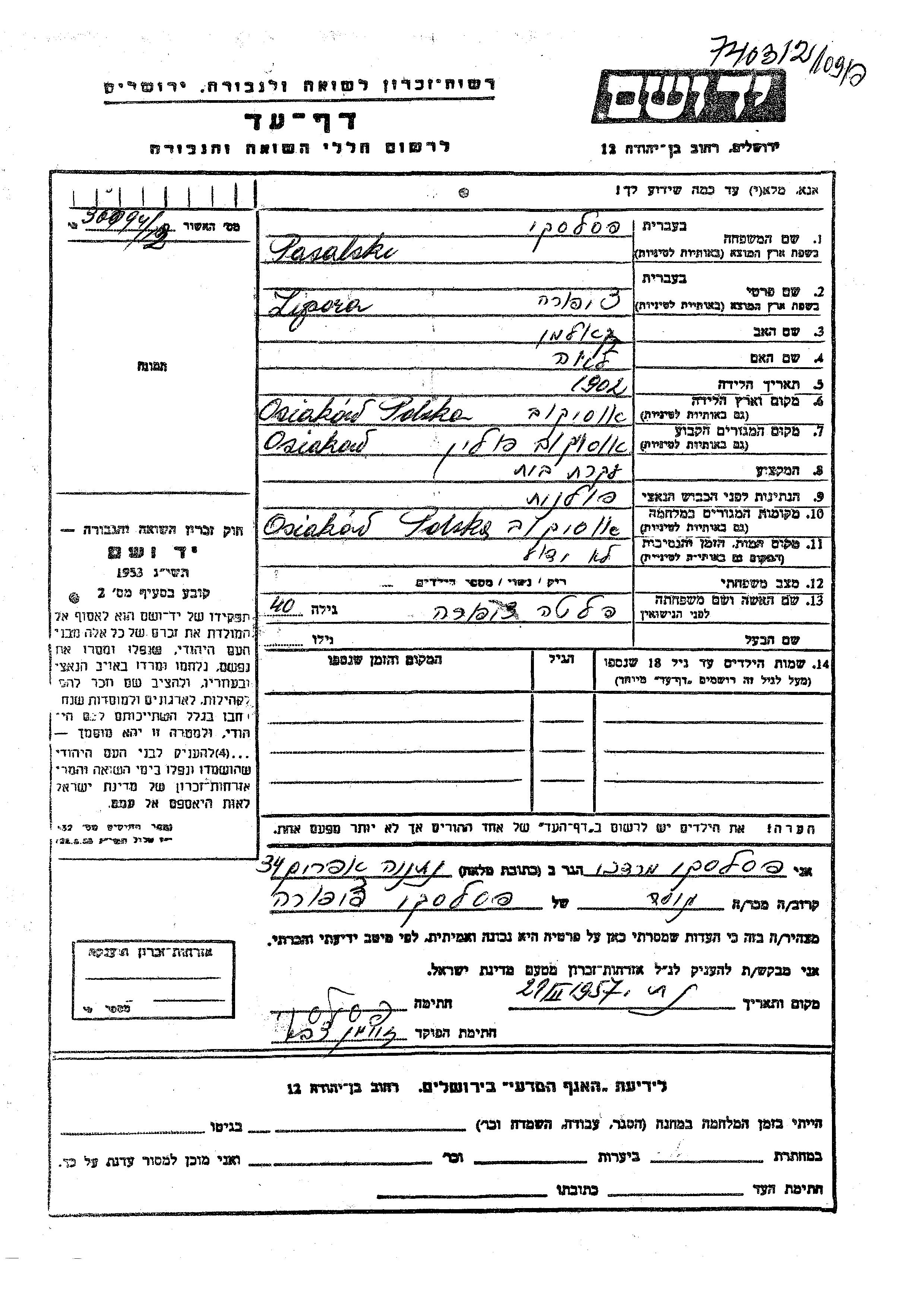 Pasalski Zipora 1902 Osiakow, Pologne Feuille de témoignage