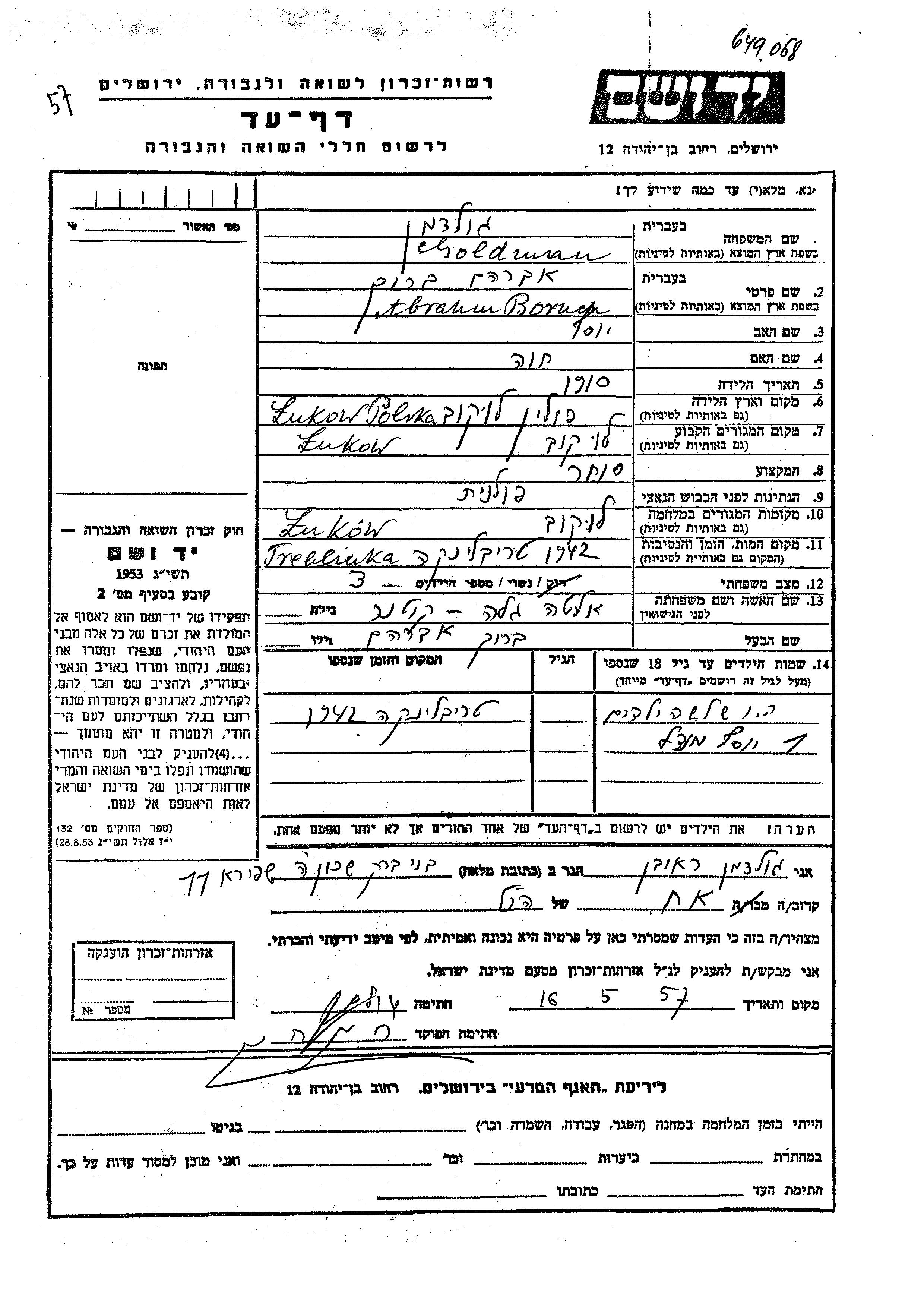 Goldman Yosef Lukow, Pologne Feuille de témoignage
