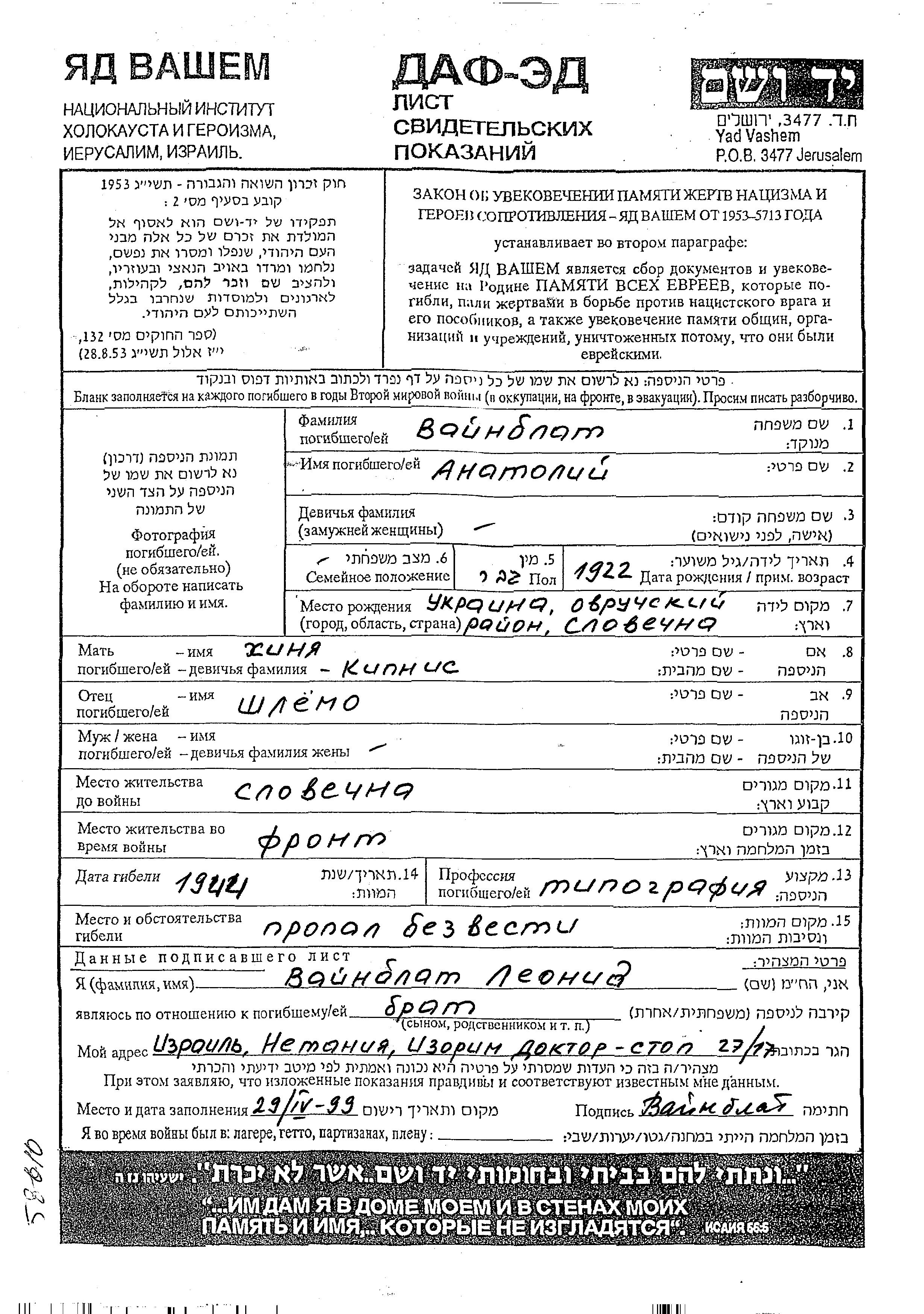 Vainblat Anatoly 1922 Slovechno, Ukraine (URSS) Feuille de témoignage