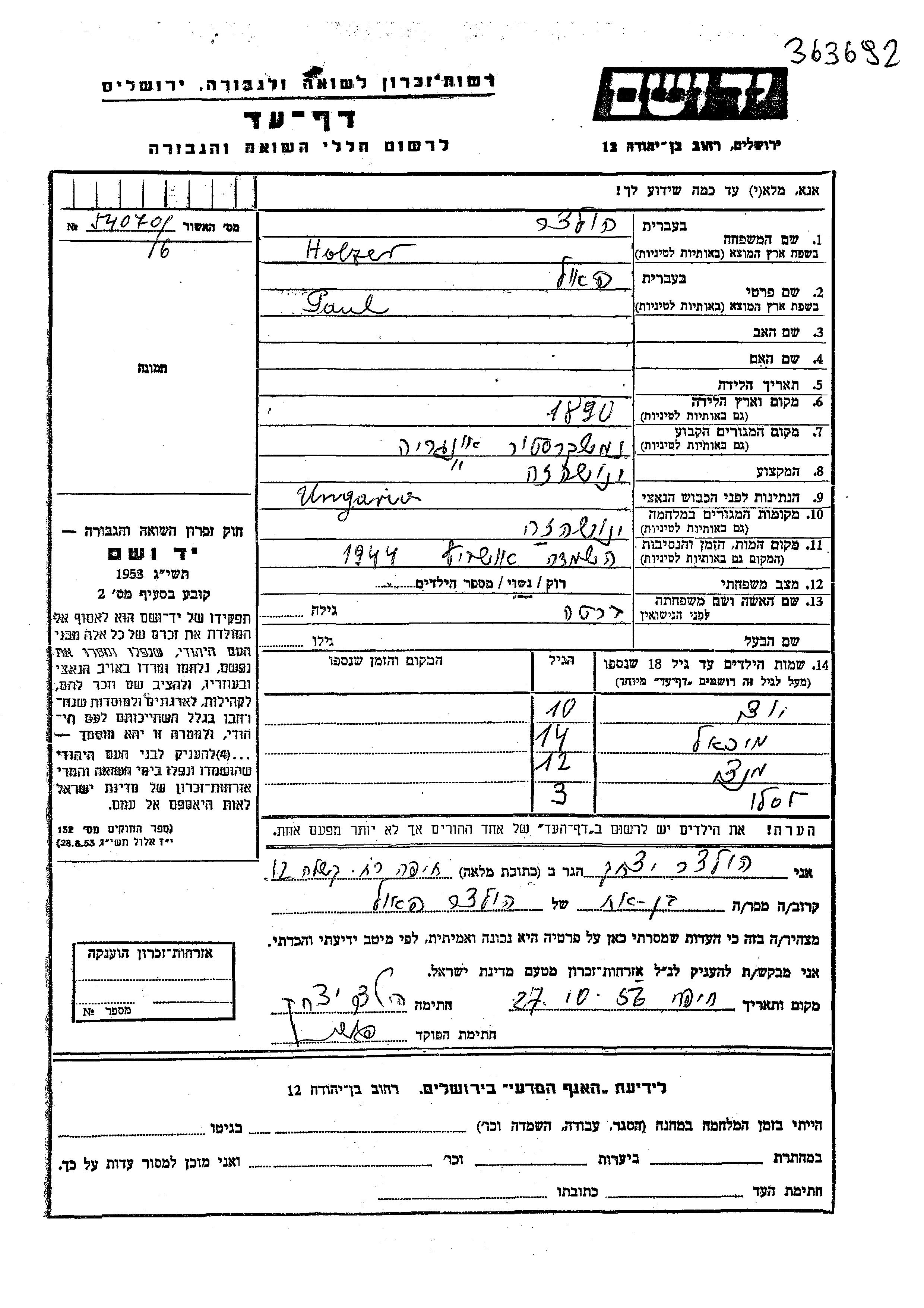 Holzer Mikhael Janoshaza, Hongrie Feuille de témoignage
