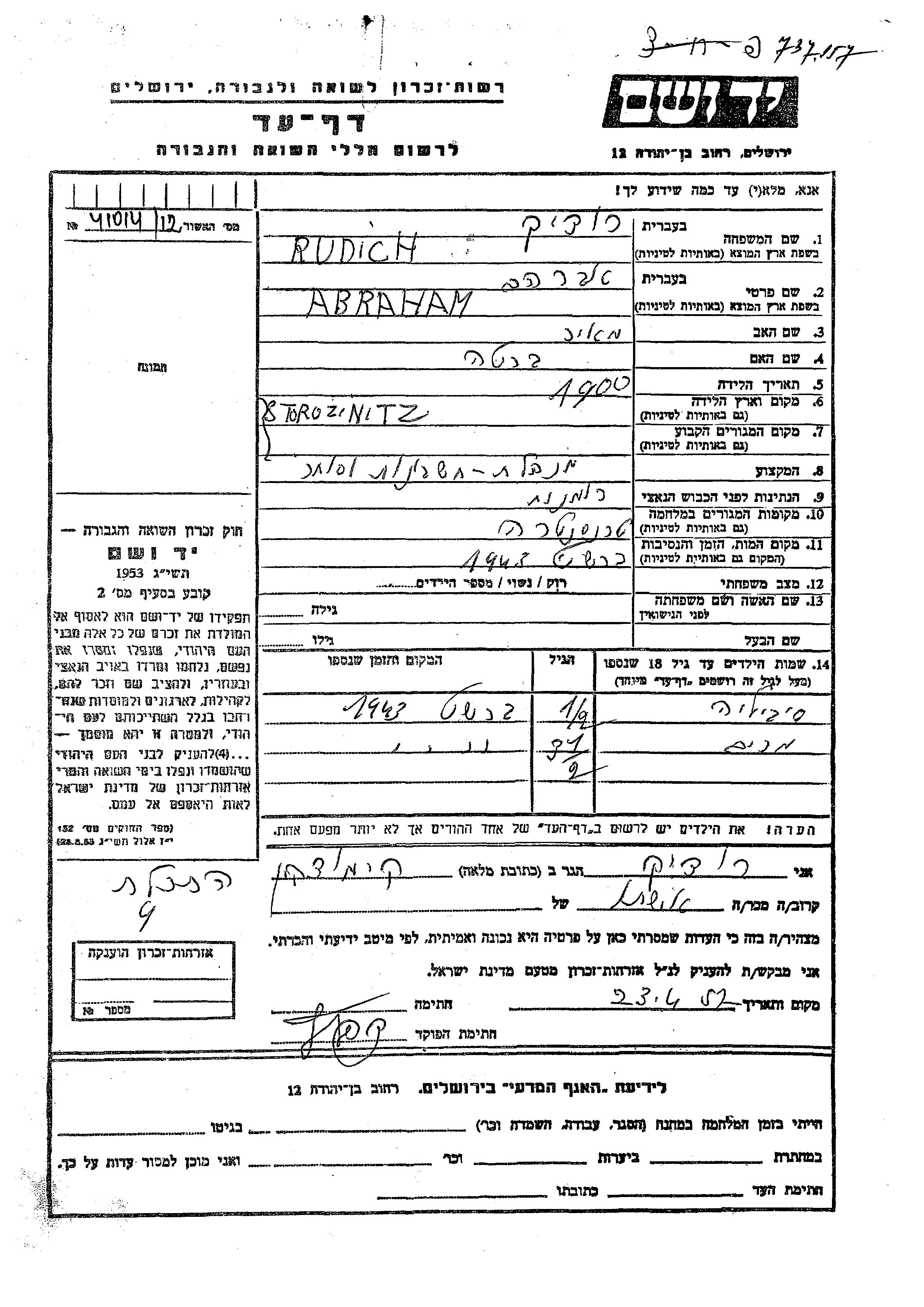 Rudich Rodik Sybilla Storozhinets, Roumanie Feuille de témoignage