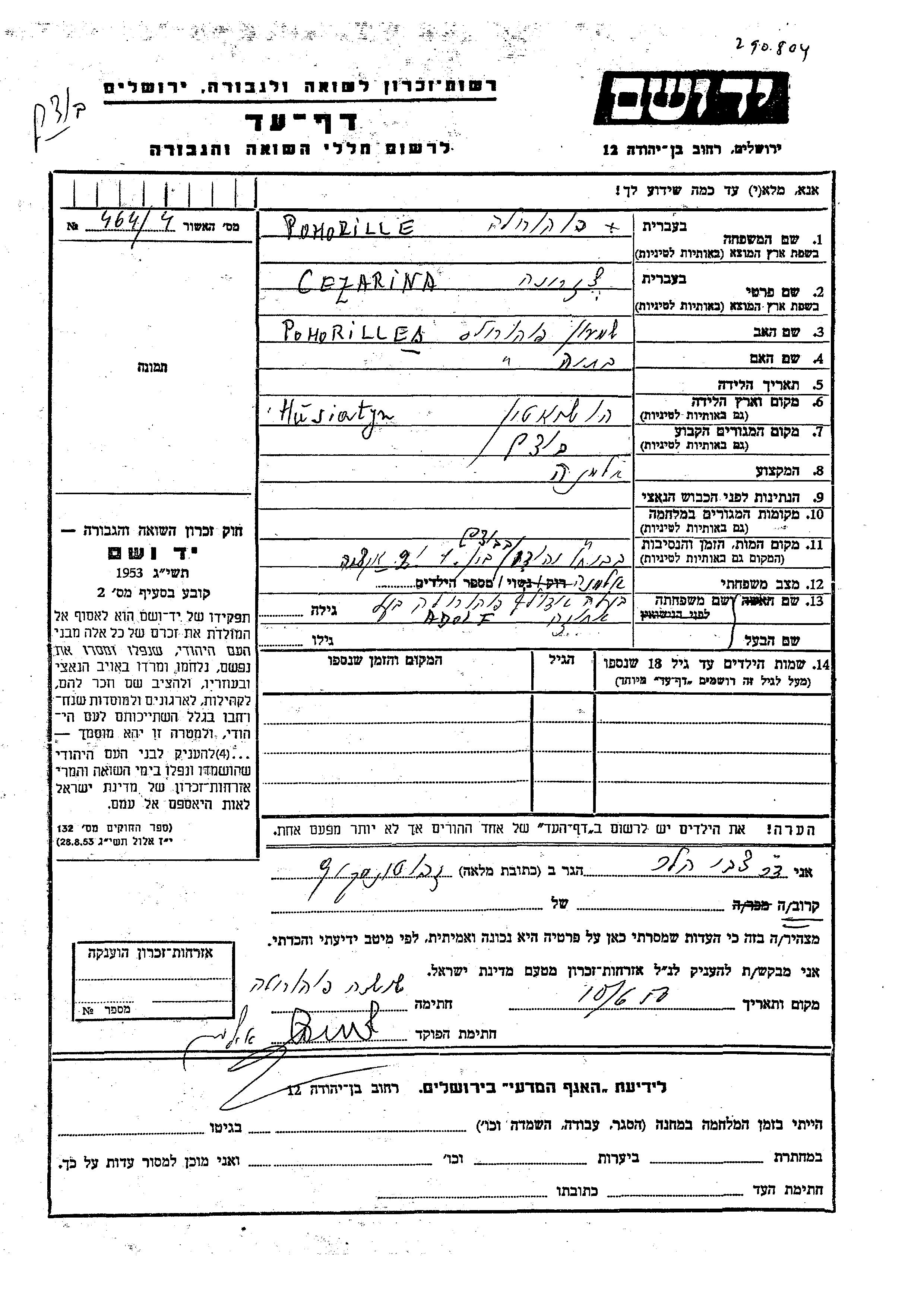Pohorille Cezarina Buczacz, Pologne Feuille de témoignage
