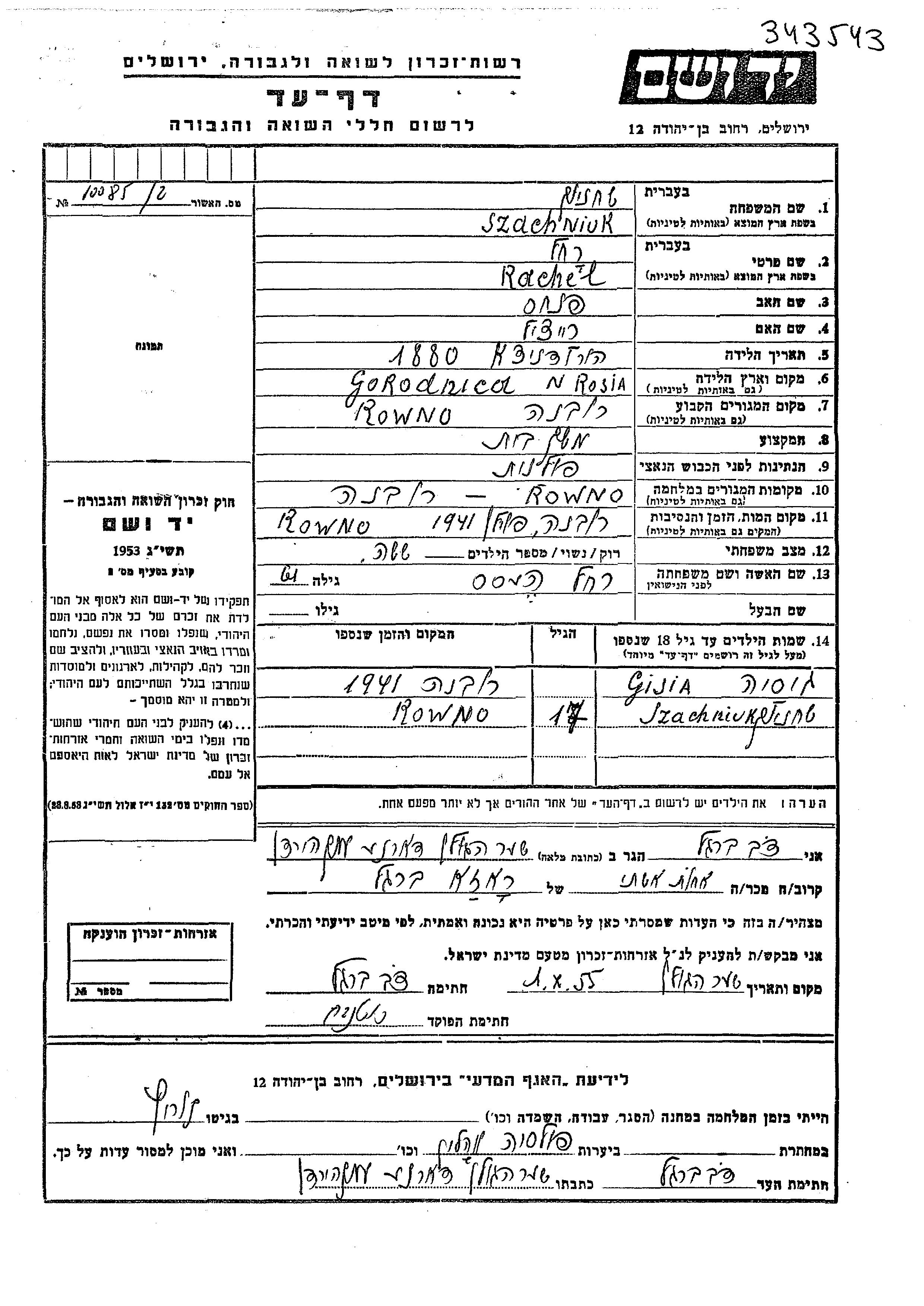 Szachniuk prénom inconnu Rowno, Pologne Feuille de témoignage