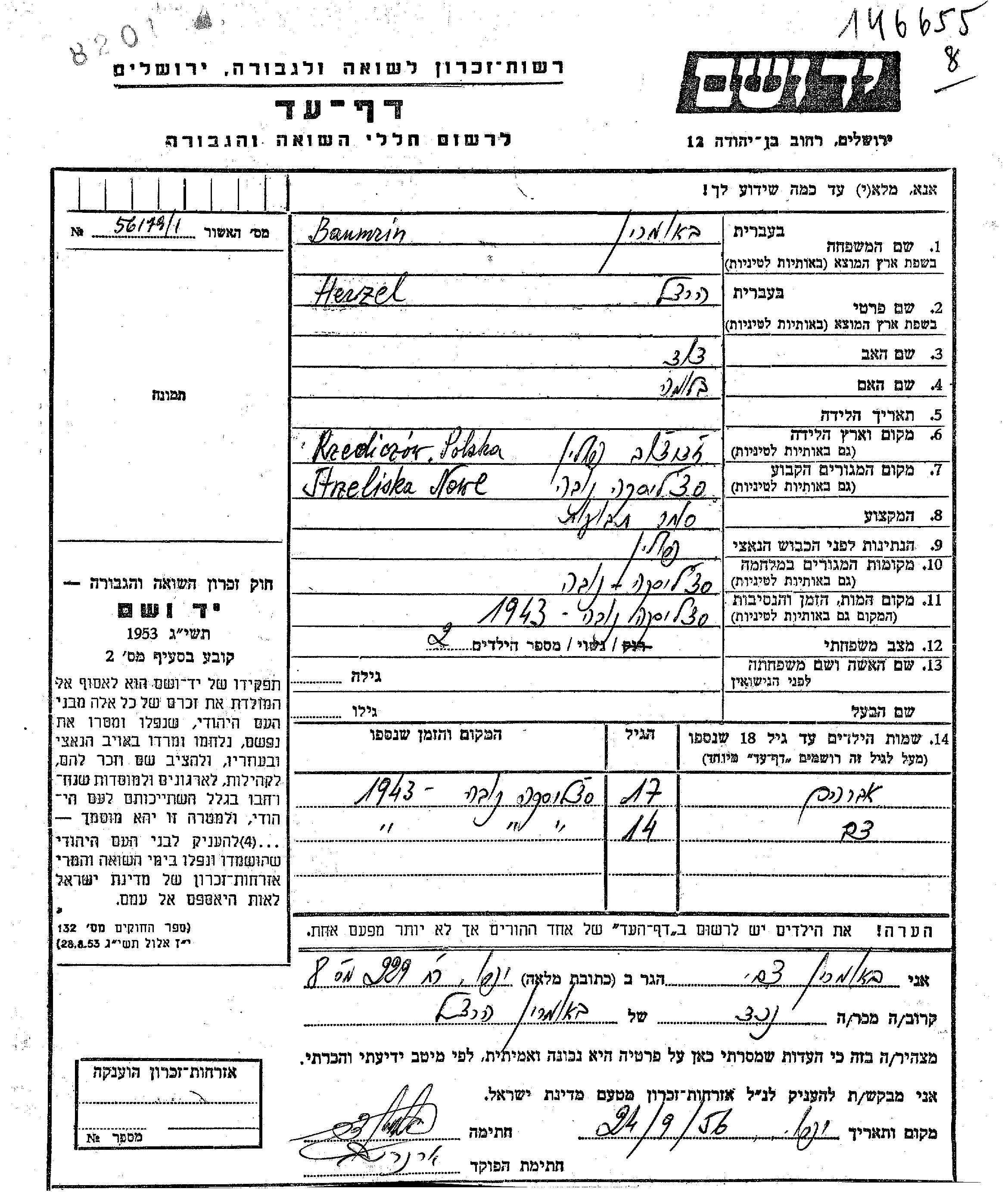 Dov Baumrin est né fils de Herzel. Il était Enfant. Avant la seconde guerre mondiale il vivait à Strzeliska Nowe, Pologne. Au cours de la guerre, il était à Strzeliska Nowe, Pologne.