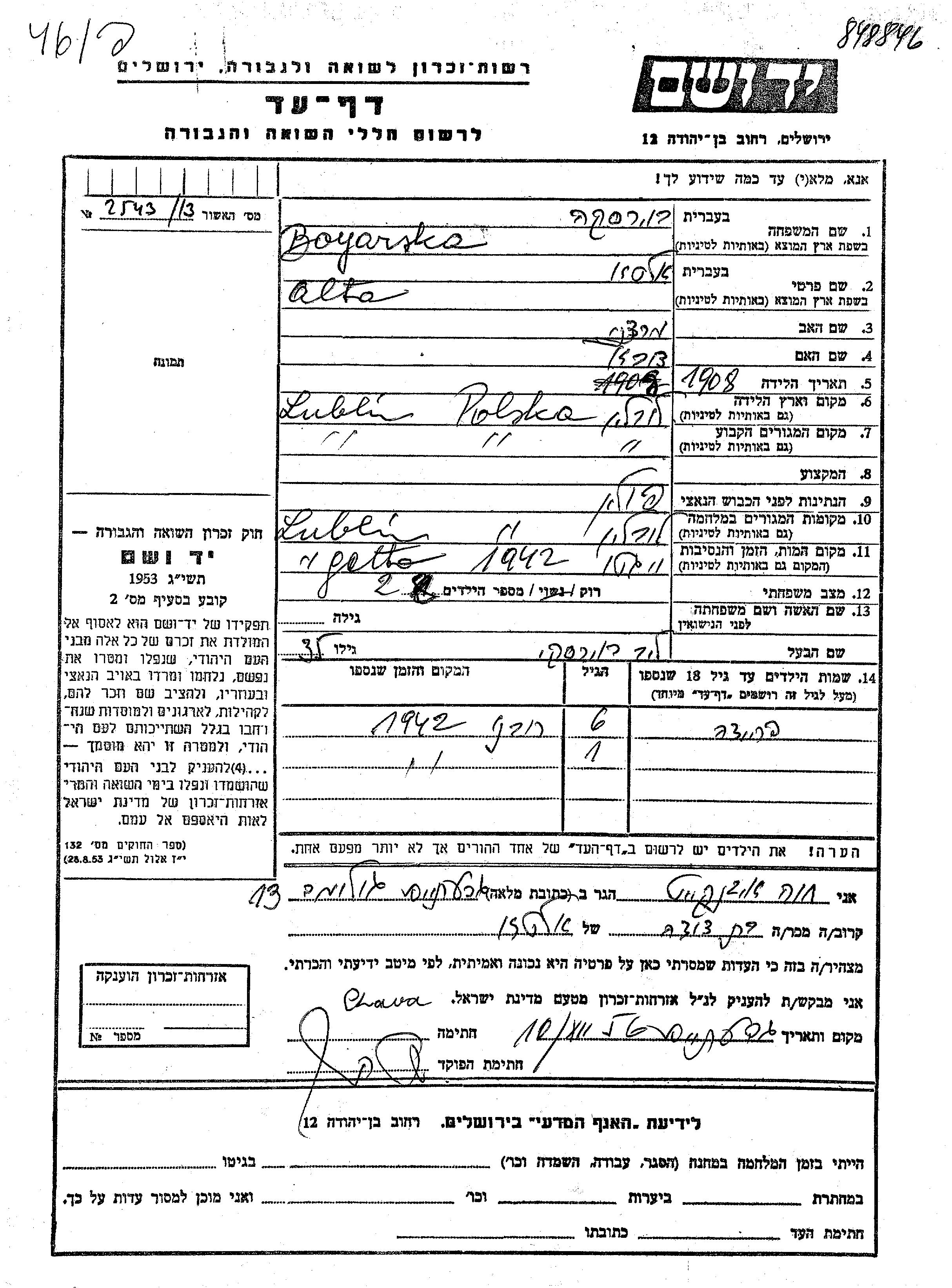 Freida Boyarska est née fille de Leib et de Alta. Elle était Enfant. Avant la seconde guerre mondiale elle vivait à Lublin, Pologne. Pendant la guerre, elle était à Lublin, Pologne.