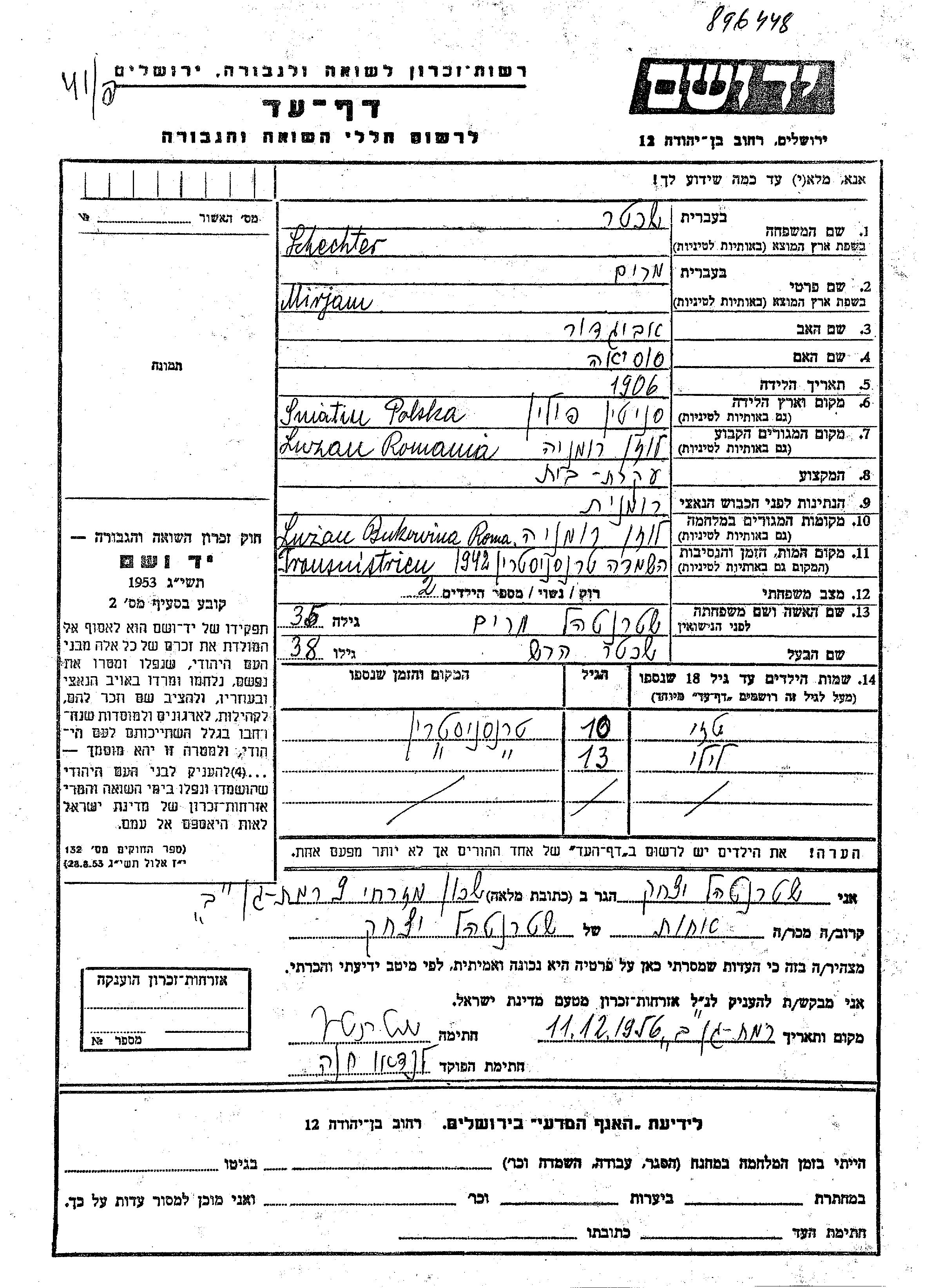 Schechter Lili Luzan, Roumanie Feuille de témoignage