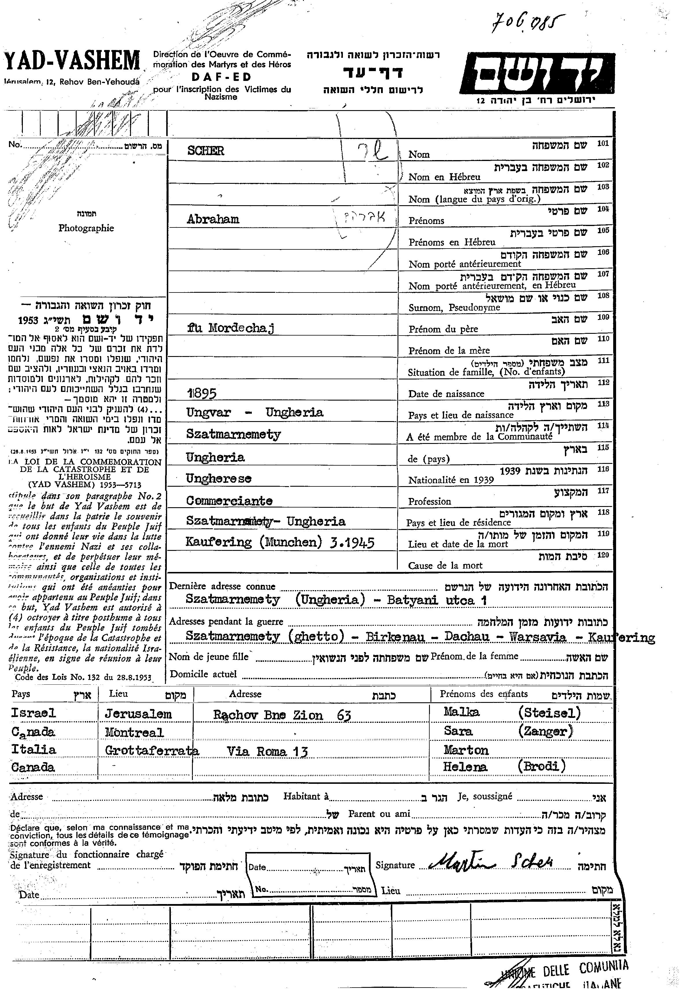Malka Scher est née fille de Abraham. Elle était Enfant. Avant la seconde guerre mondiale elle vivait à Hongrie. Pendant la guerre, elle était à Hongrie.