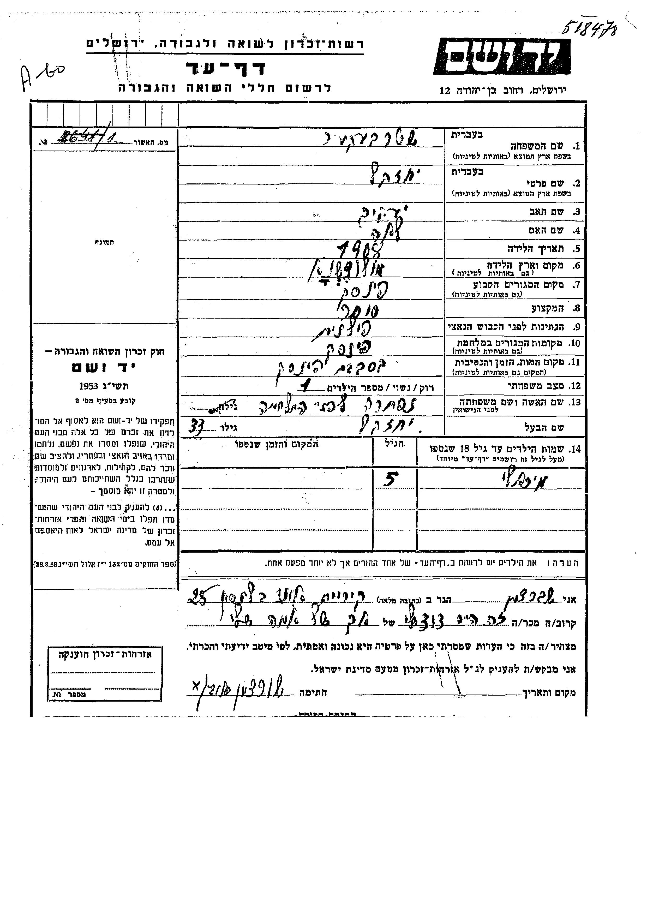 Yad Vashem - Pages of Testimony Names Memorial Collection
