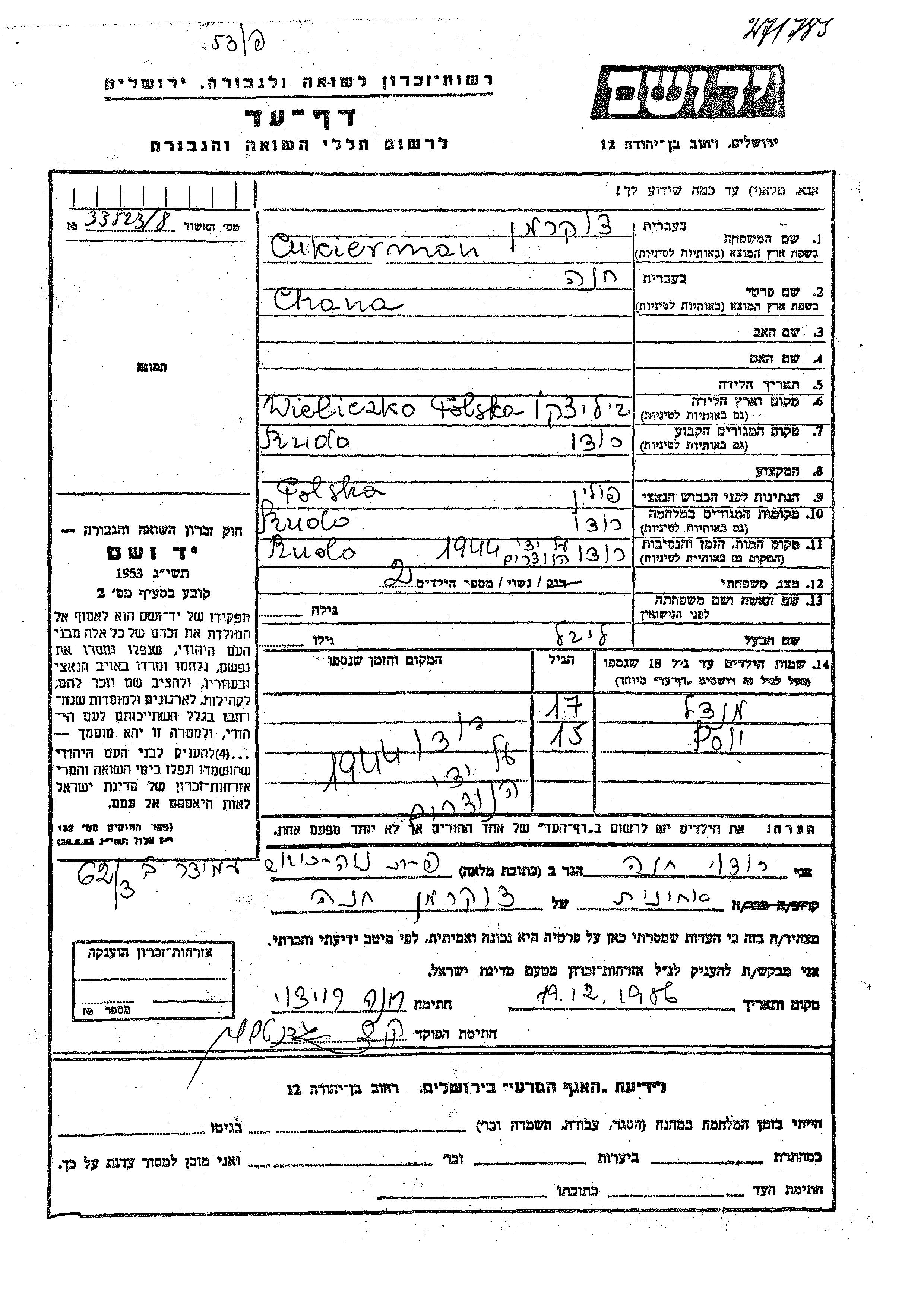 Cukierman Mendel Ruda, Pologne Feuille de témoignage