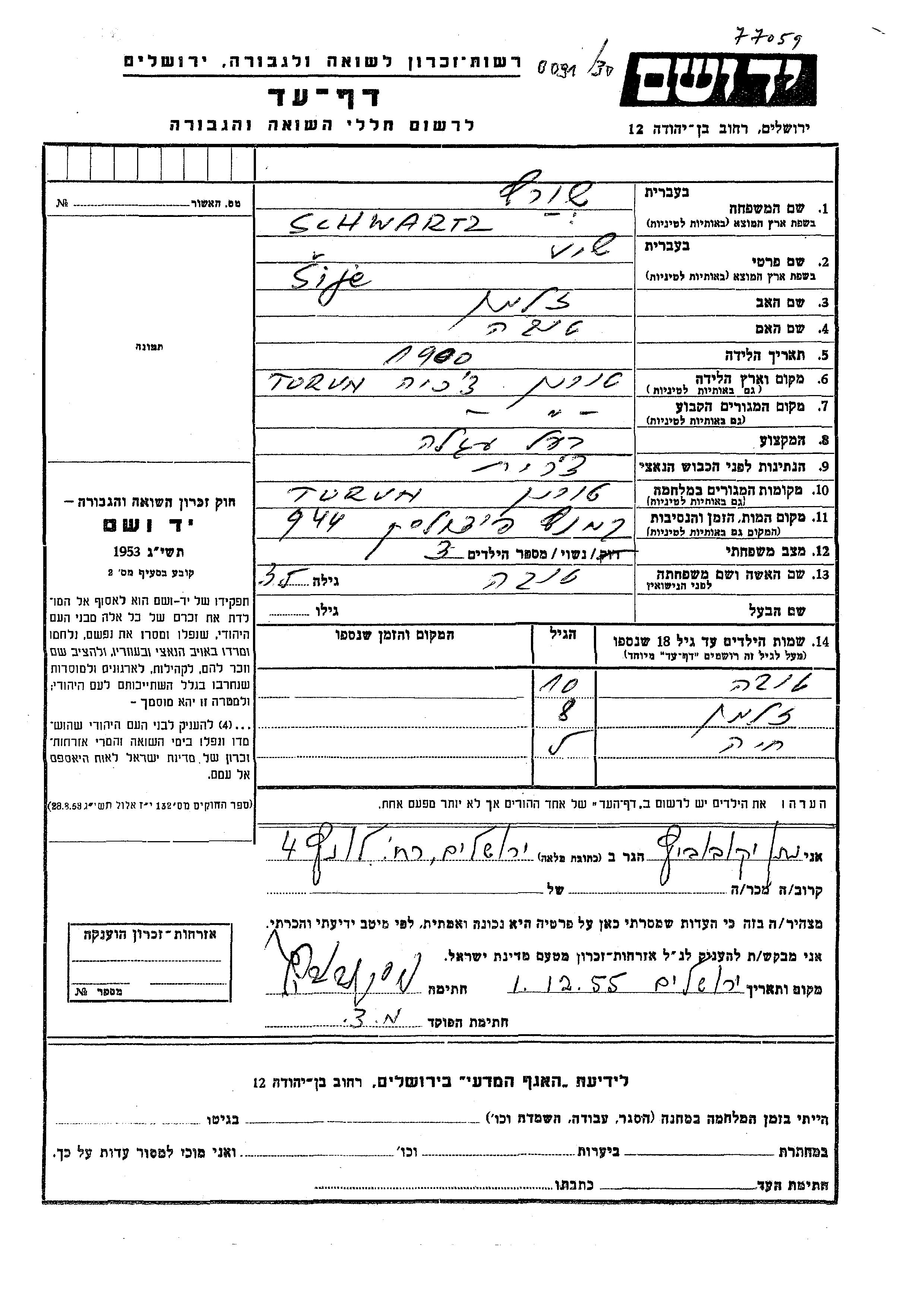 Schwartz Tova Torun, Tchécoslovaquie Feuille de témoignage