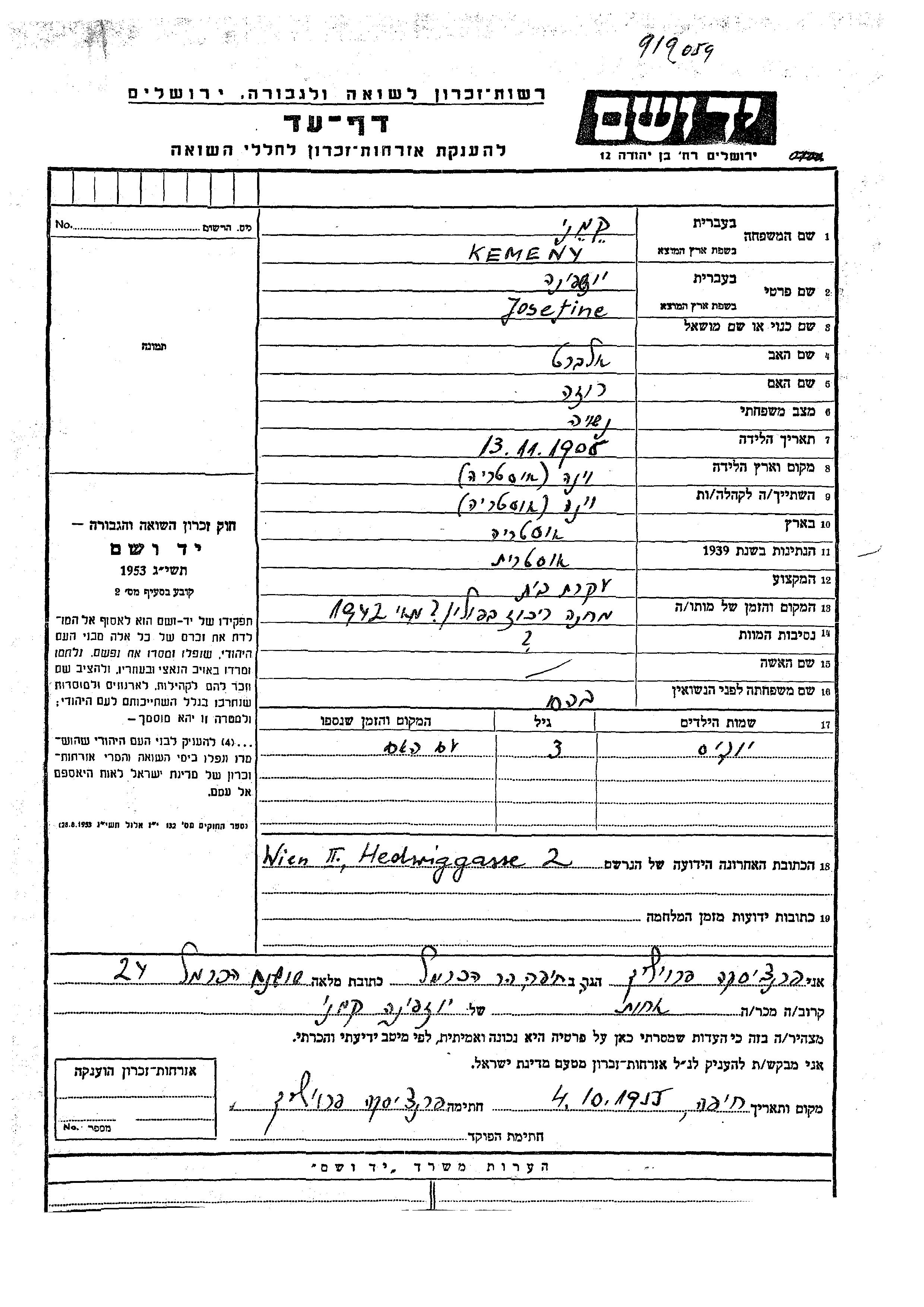 Kemeny Yehudit Wien, Autriche Feuille de témoignage