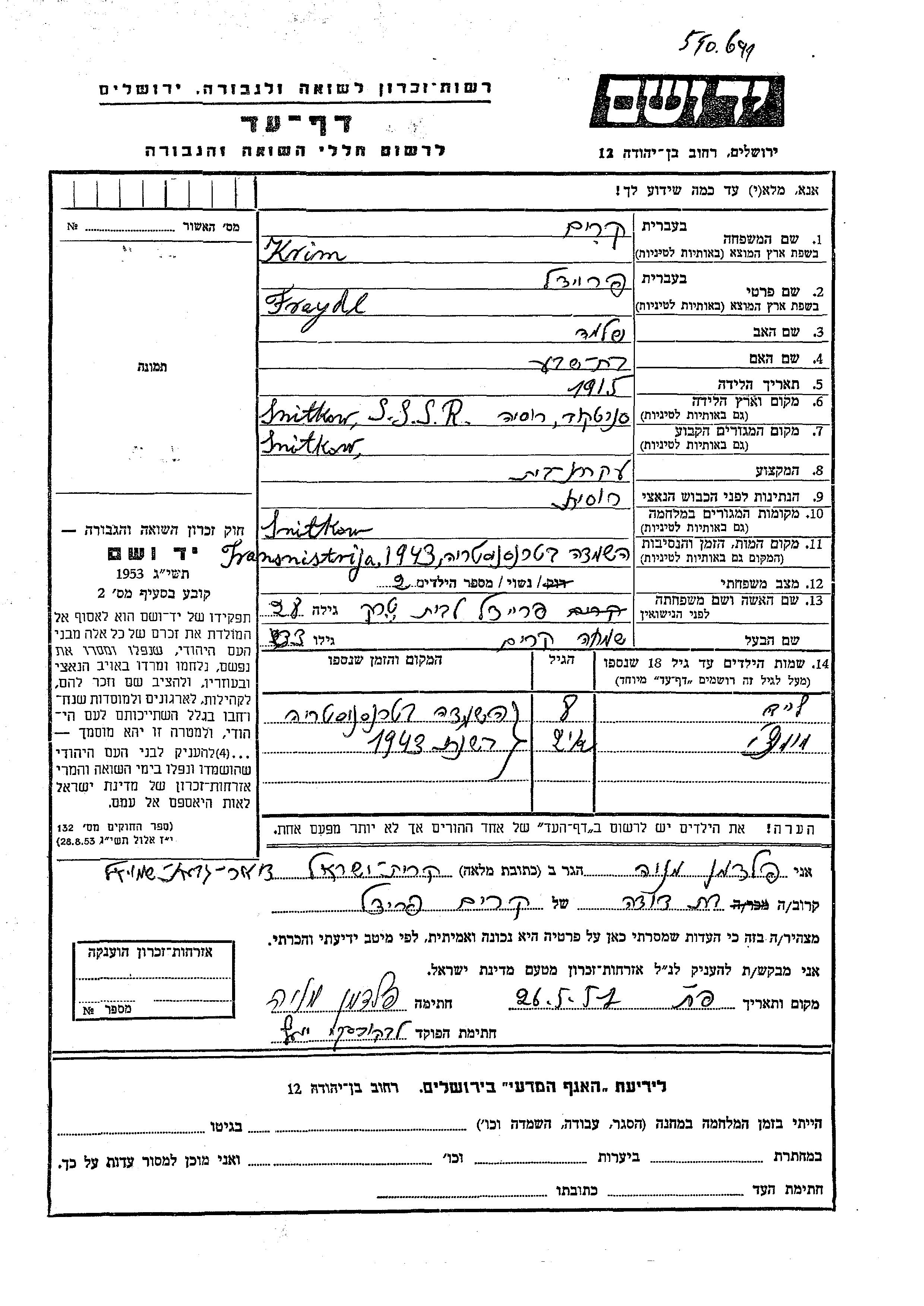 Yad Vashem - Pages of Testimony Names Memorial Collection
