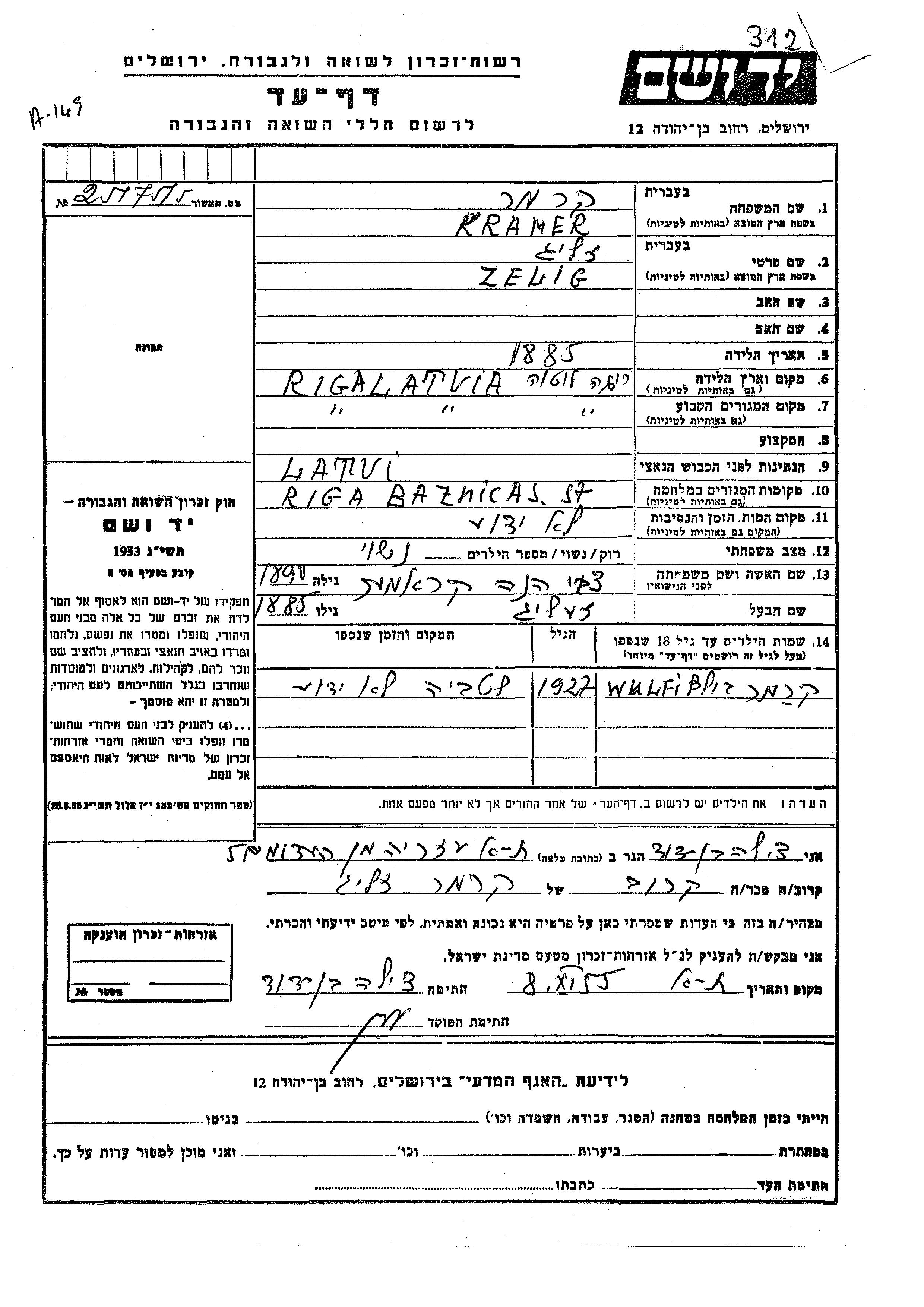 Wulfi Kramer est né fils de Zelig et de Tzvi Hena née Kramer. Il était Enfant. Avant la seconde guerre mondiale il vivait à Riga, Lettonie. Au cours de la guerre, il était à Riga, Lettonie.