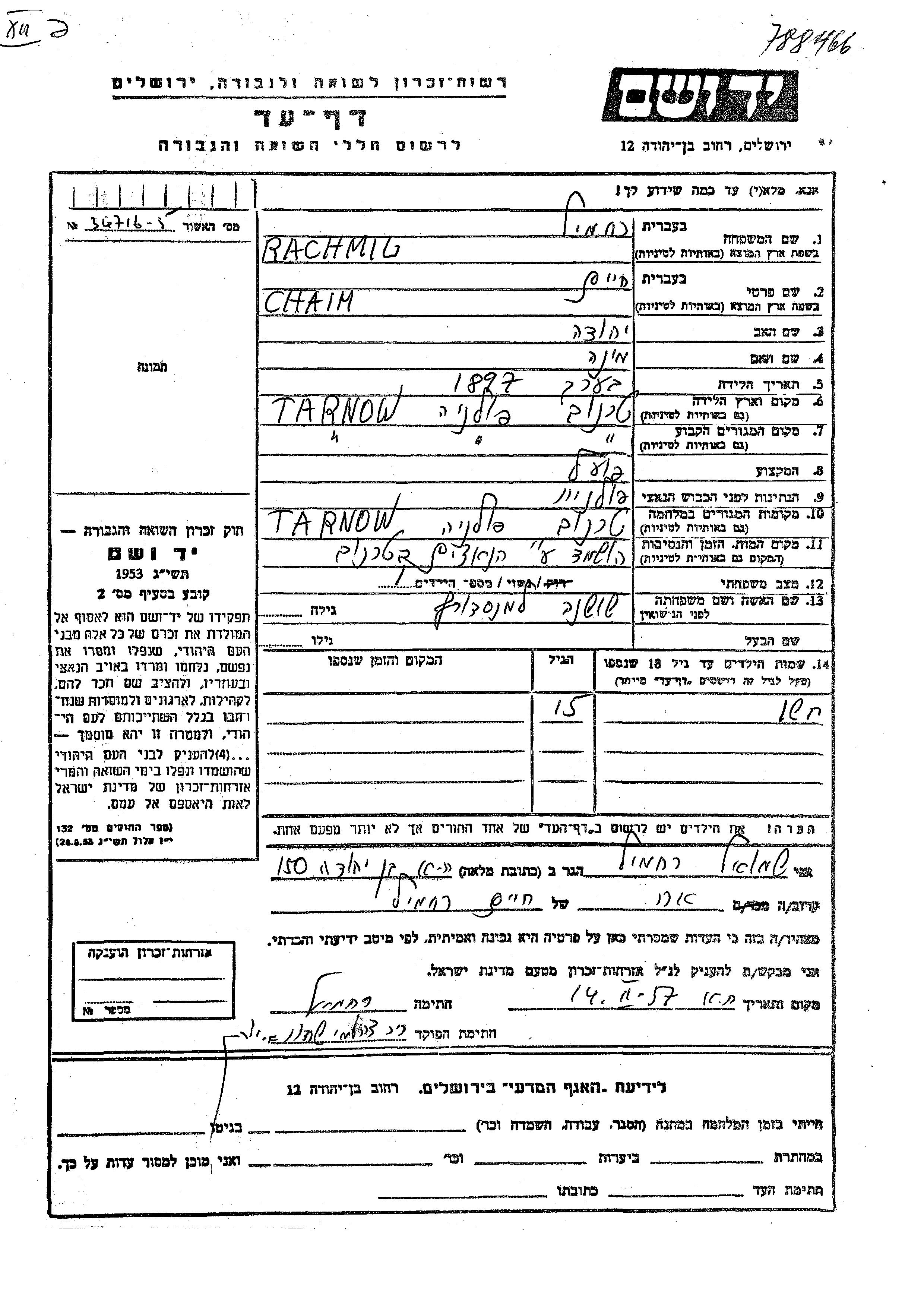 Rachmil Khesho Tarnow, Pologne Feuille de témoignage