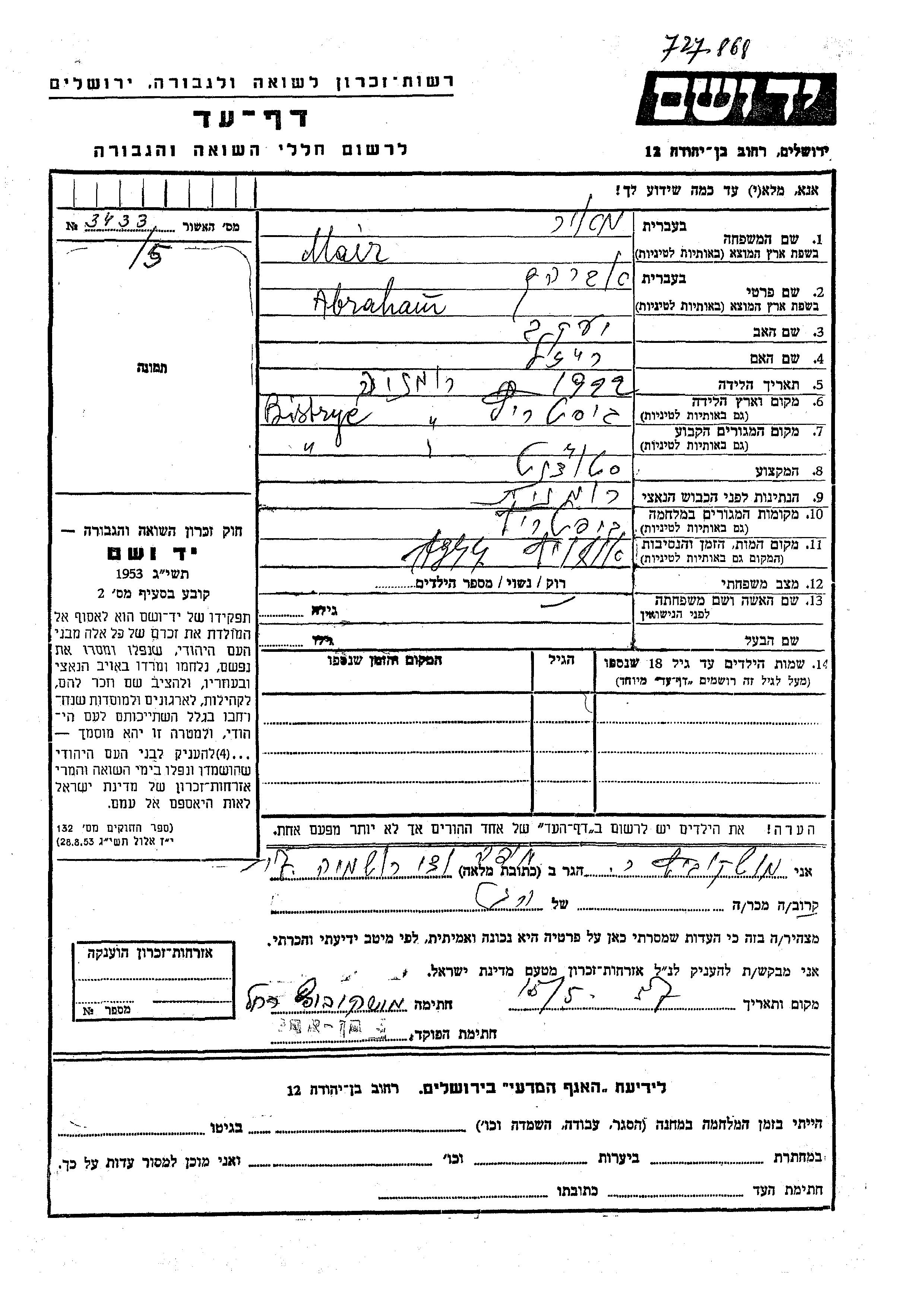 Mair Abraham 1922 Bistryc, Roumanie Feuille de témoignage