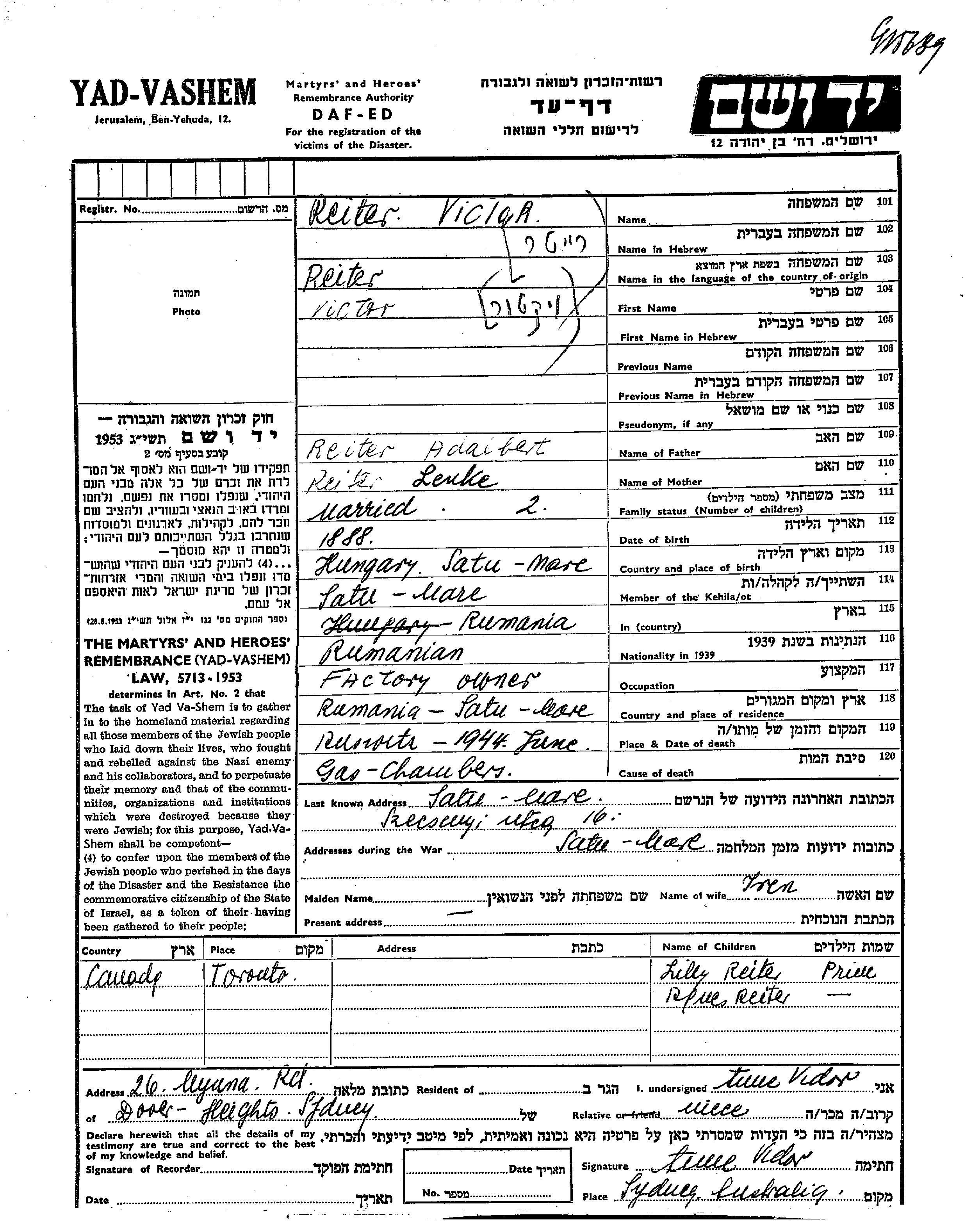 Reiter Lilly Satu Mare, Roumanie Feuille de témoignage