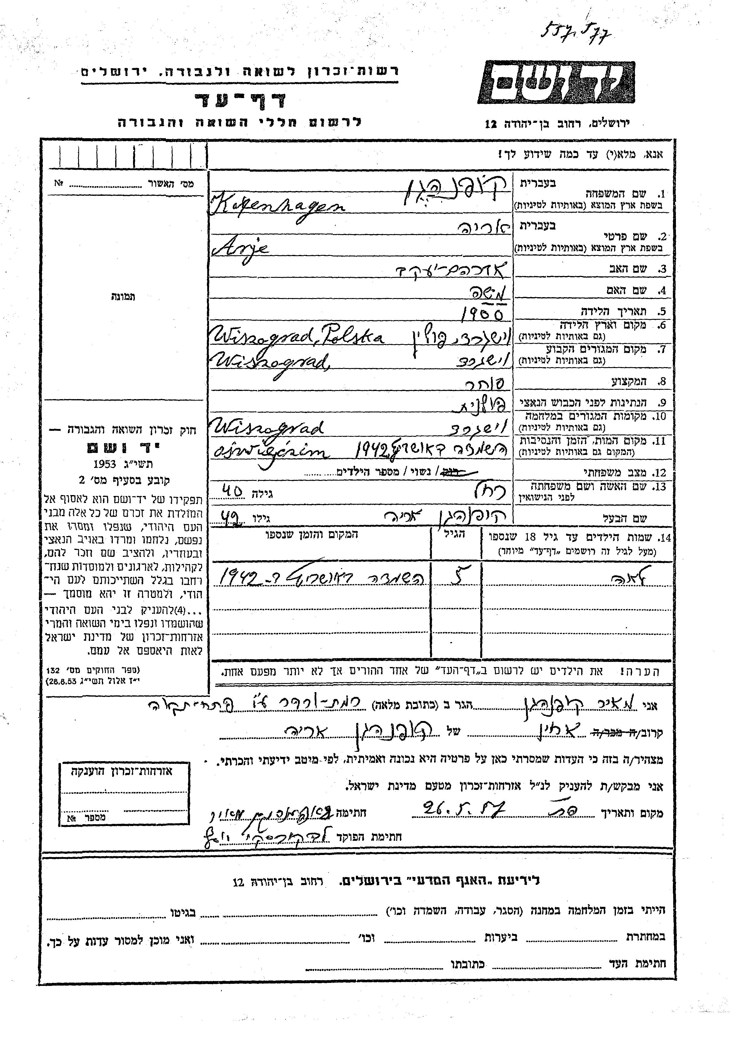 Kofenhagen Lea Wiszogrod, Pologne Feuille de témoignage